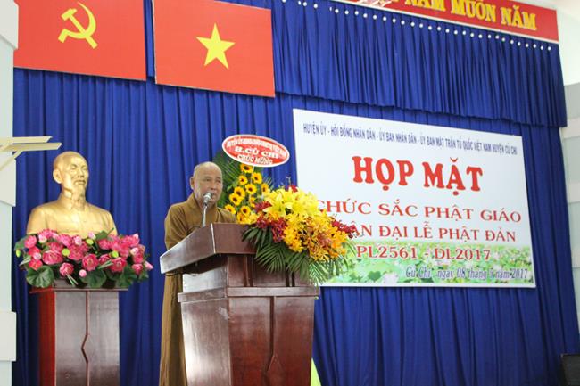 Ông Dương Văn Tháo, Chủ tịch Ủy ban MTTQ Việt Nam huyện Củ Chi đã ghi nhận những đóng góp của các vị chức sắc và đồng bào Phật tử trên địa bàn trong phát triển kinh tế – xã hội huyện thời gian qua; chúc Ban Trị sự Giáo hội Phật giáo Việt Nam huyện, các tăng ni, cư sĩ, phật tử có mùa đại lễ Phật đản Phật lịch2561 – dương lịch.2017 an vui, hạnh phúc. Đồng chí cũng đề nghị các chức sắc, Phật tử trên địa bàn phát huy hơn nữa vai trò khối đại đoàn kết dân tộc, tham gia công tác xã hội nhân đạo, các cuộc vận động, góp phần cùng với Đảng bộ, chính quyền Củ Chi thực hiện hiệu quả chính sách an sinh xã hội.