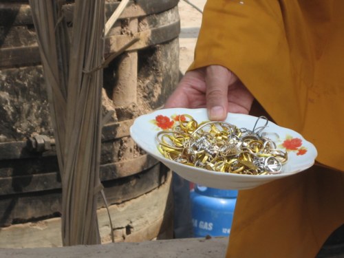 Hàng trăm Phật tử đã thành kính, thanh tịnh cúng dàng hơn 30 cây vàng (hoa tai, nhẫn, dây chuyền, vàng lá…) để thả vào nước đồng nung chảy đúc nên Pháp khí nhà Phật.