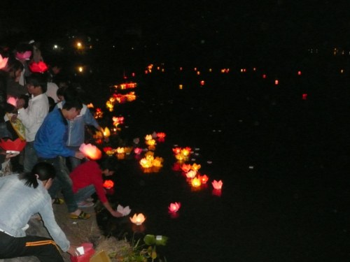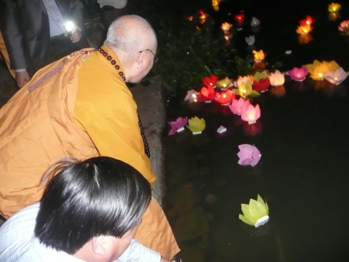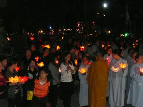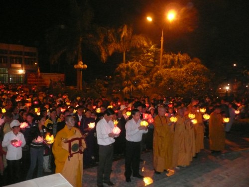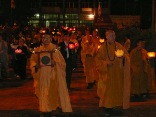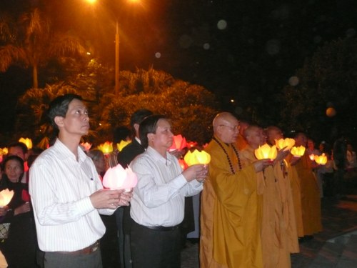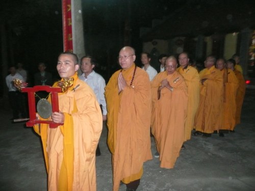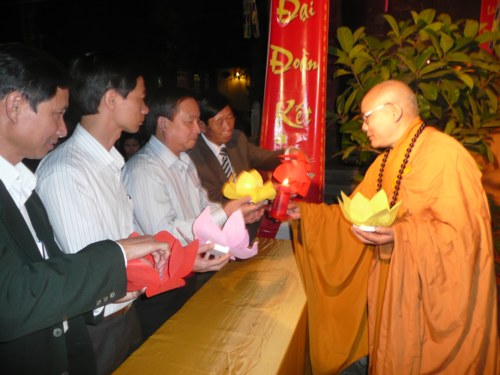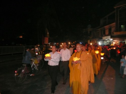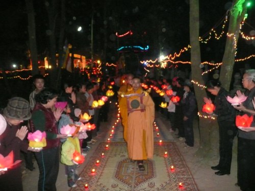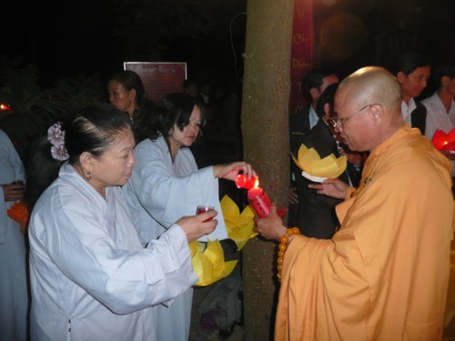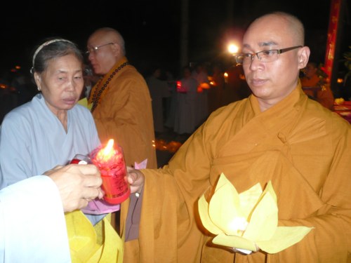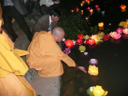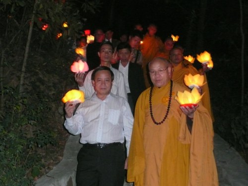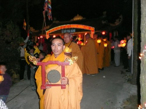 Tiếp thep là lễ truyền đăng từ ban thờ Phật. Chư Tôn đức, lãnh đạo các ban ngành và đồng bào Phật tử đã truyền rước hoa đăng từ lễ đài đến lầu Quan Âm, xuống núi đến đài liệt sỹ và bến sông Độ Giang để phóng đăng cầu âm siêu dương thái, đất nước hòa bình, nhân dân tai qua nạn khỏi.