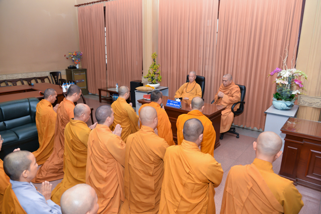 Chư tôn đức Hội đồng điều hành Học viện và Nhân viên văn phòng HVPGVN TP.HCM chúc tết và vấn an Nhị vị Hòa thượng viện Trưởng và Phó viện trưởng thường trực