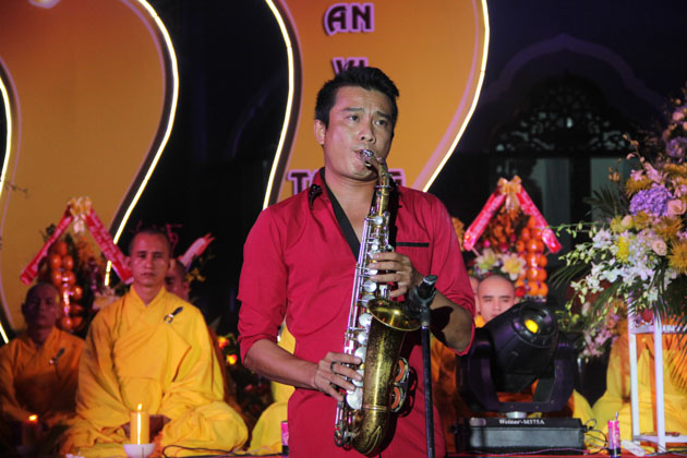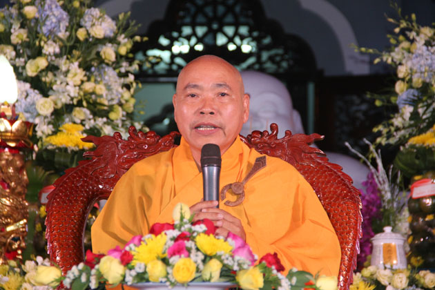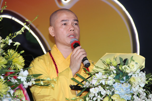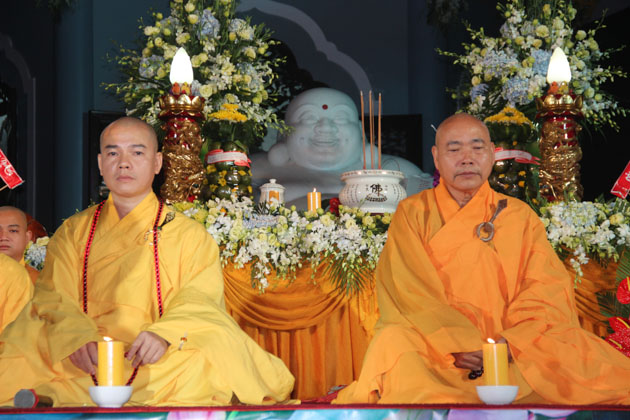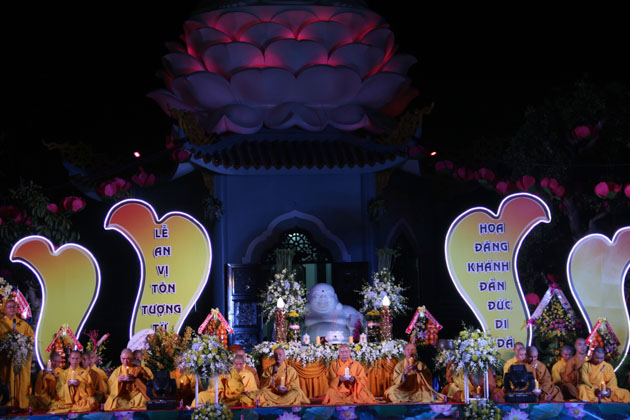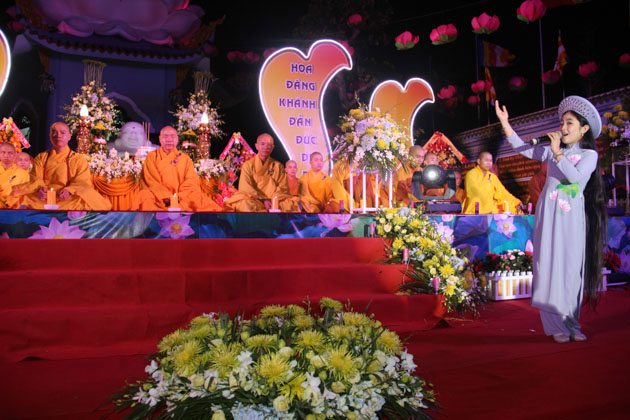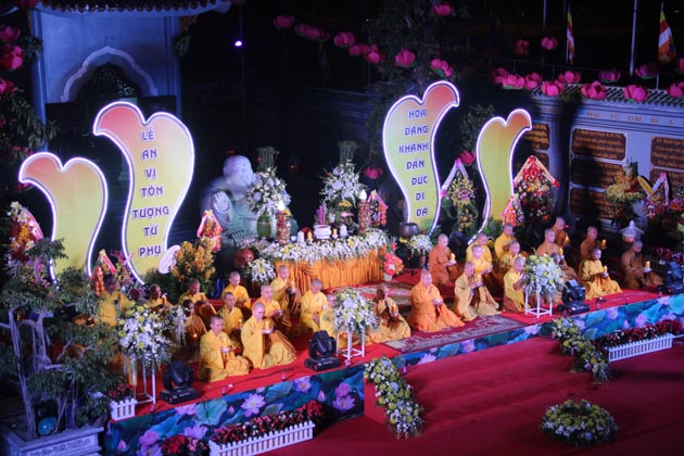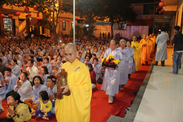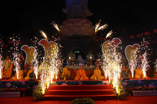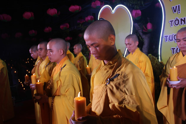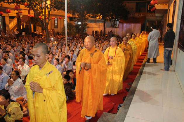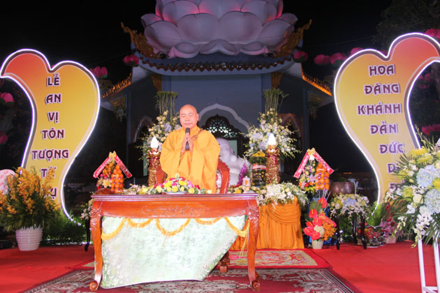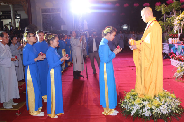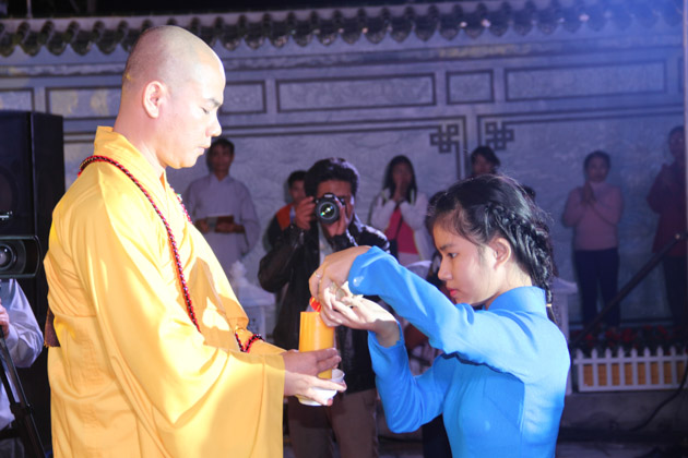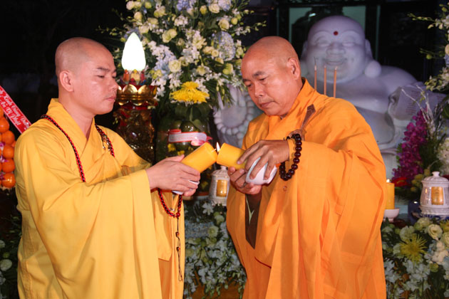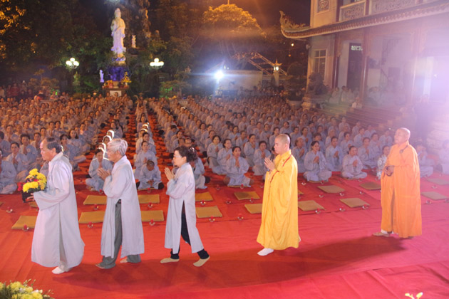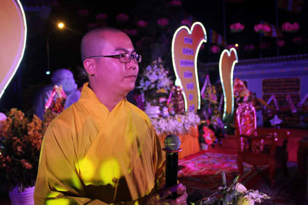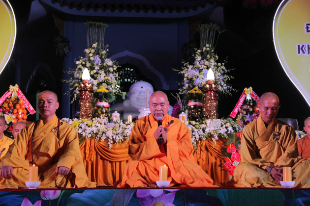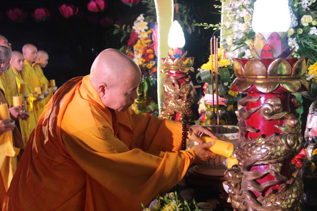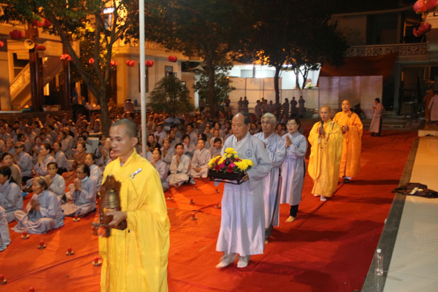 Sau lời tuyên bố khai mạc của ĐĐ. Thích Thông Đạo – Trưởng ban tổ chức đêm lễ hội hoa đăng, HT. Thích Viên Giác đã cung thỉnh lửa thiêng từ Phật đài, truyền đến Đại đức Trú trì như một biểu tượng của Tăng đoàn hòa hợp, chánh pháp rạng ngời.