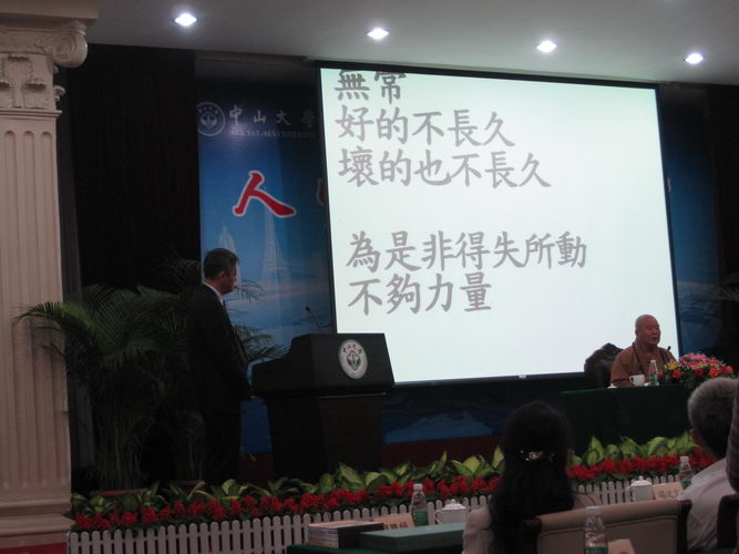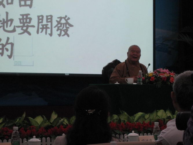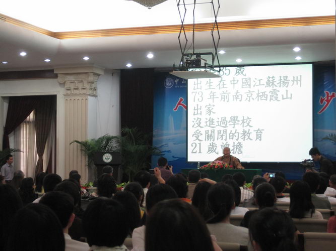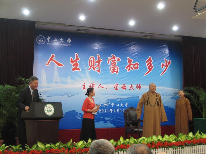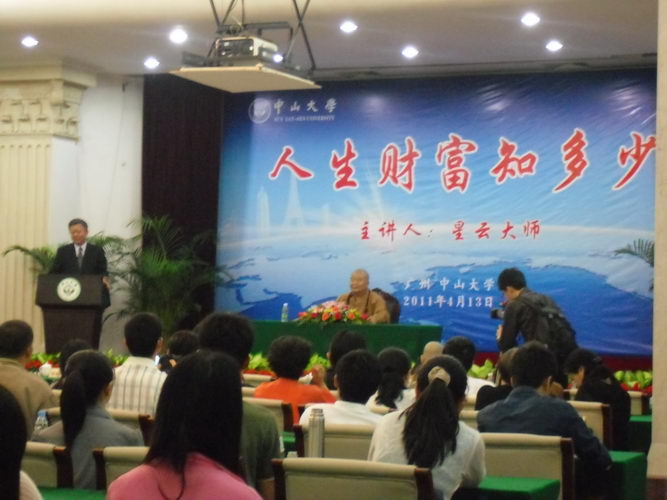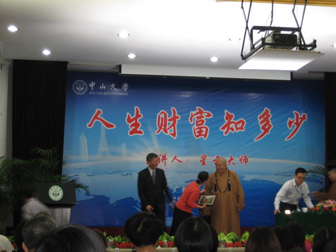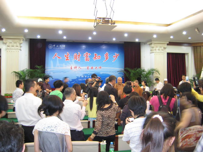 Sau nghi thức tiếp đón được diễn ra trong không khí hân hoan long trọng tại hội trường XiaoLiTang (Nơi dành tiếp đón khách mời danh dự), Hòa thượng đã bắt đầu buổi nói chuyện với đề tài: Nhân Sanh Tài Phú Tri Đa Thiểu (“人生才富知多少” Gia tài của đời người biết có bao nhiêu)