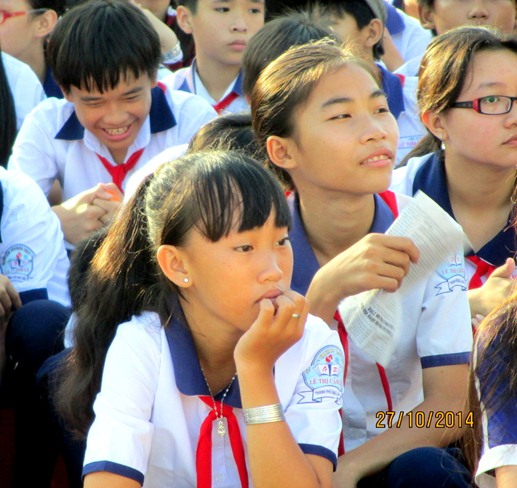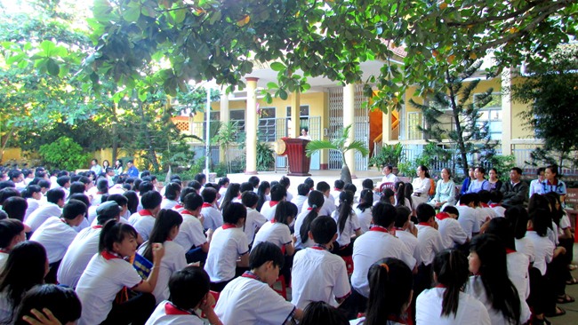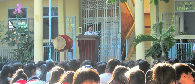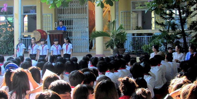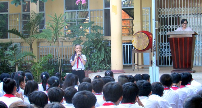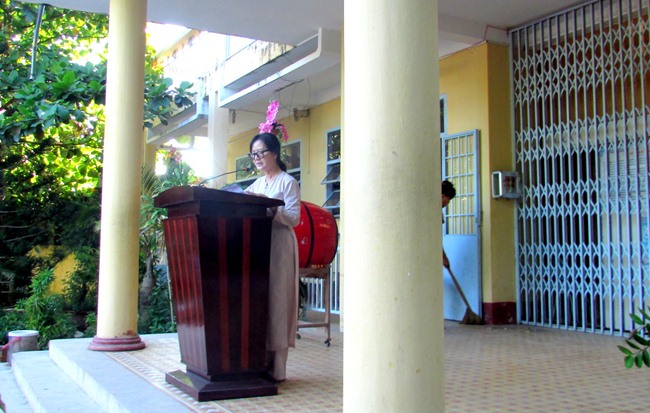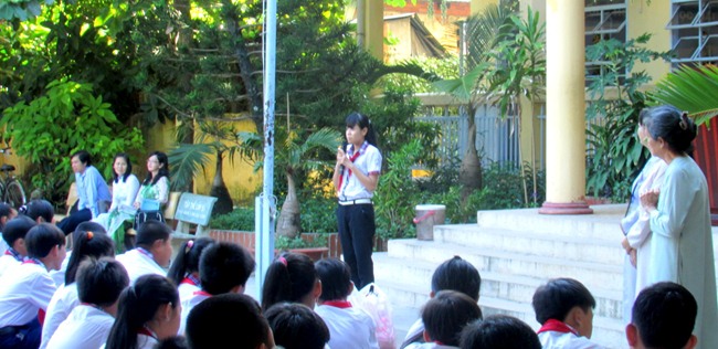 Đoàn do cô Phương Tuệ làm Trưởng đoàn, đúng 7h00” đã có mặt tại trường THCSLê Thị Cẩm Lệ. Hòa cùng không khí trang nghiêm của buổi Lễ chào cờ, thầy Hiệu trưởng Trần Bằng Phi, trịnh trọng giới thiệu sự có mặt của Hội Từ Thiện và mời cô Phương Tuệ lên chia sẻ dưới cờ: