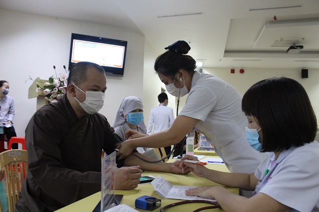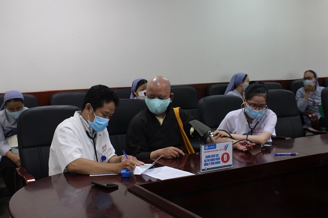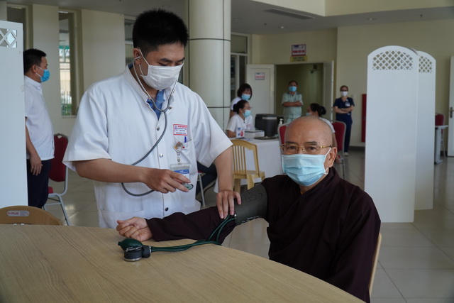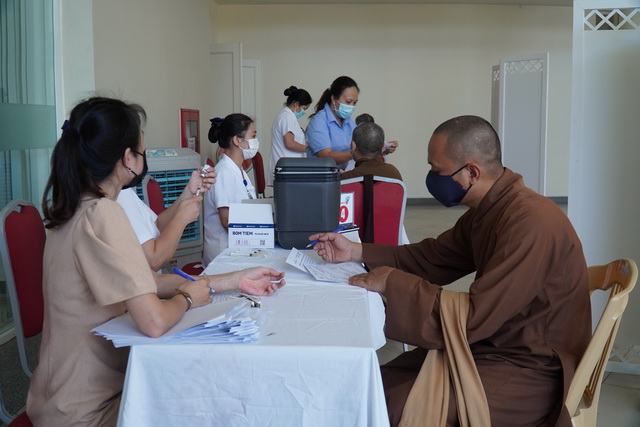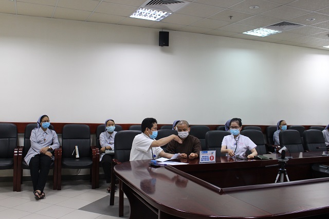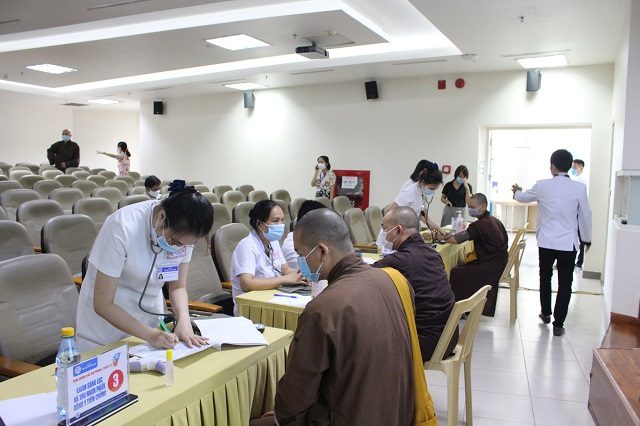Trước khi tiêm chủng, chư Tôn đức đã được khám sàn lọc kỹ, sau đó quý bác sĩ đã phân công 06 tổ tiêm thực hiện tiêm chủng cho 120 thành viên của đơn vị Ban Trị sự GHPGVN tỉnh.