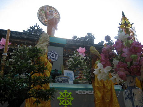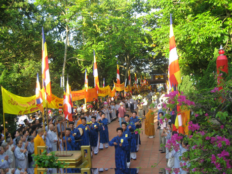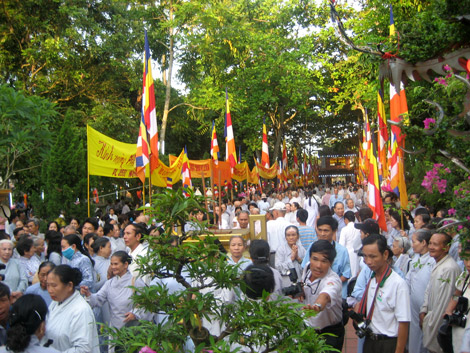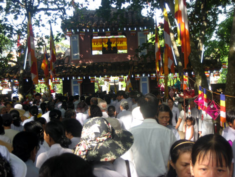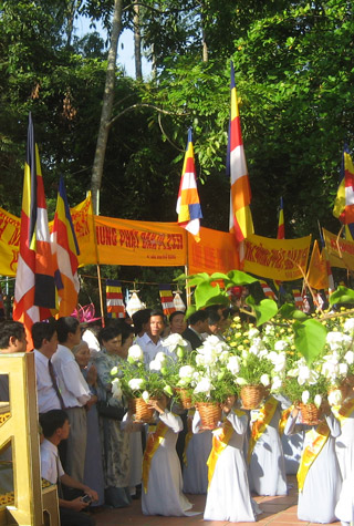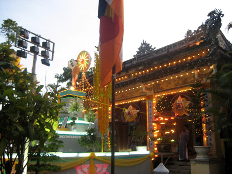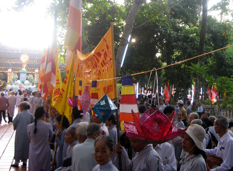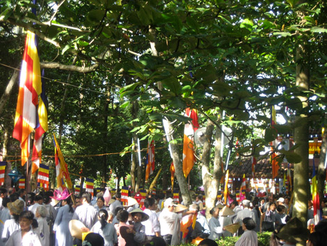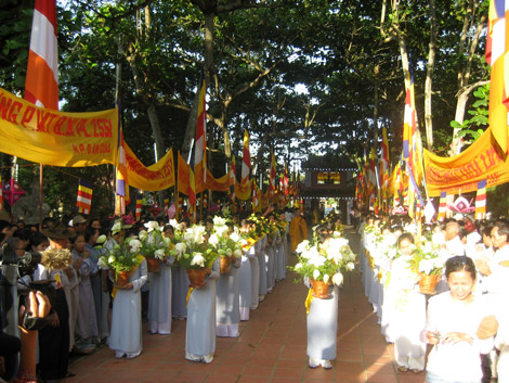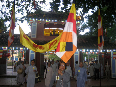 Vào sân chùa, thiệt là là cả một thế giới của cờ, hoa và biểu ngữ.