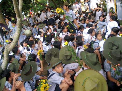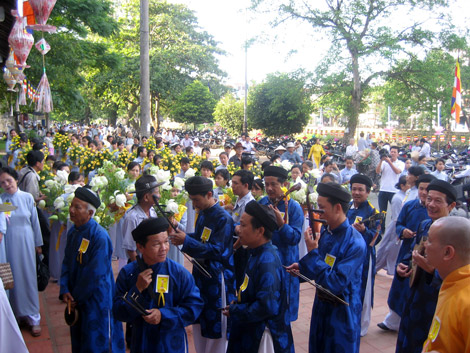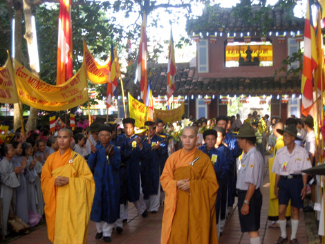 Khắp nơi, trong và ngoài chùa, hàng trăm em thanh thiếu niên trong các bộ đồng phục thuộc các gia đình Phật tử làm trật tự viên, rất có tổ chức và niềm nở. Dường như tất cả mọi người đến đây đều có tổ chức. Mỗi người là một trật tự viên.