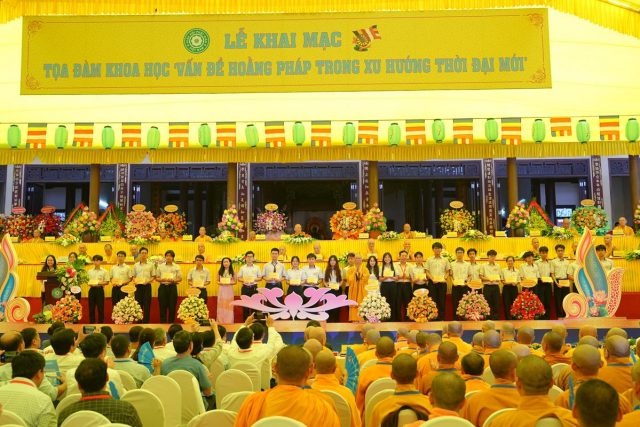 Sau chương trình lễ khai mạc, hội chúng đã lắng nghe 3 bài tham luận của Hòa thượng Thích Gia Quang – Phó chủ tịch HĐTS, Trưởng Ban thông tin truyền thông TW; Hòa thượng Thích Huệ Thông – Phó chủ tịch HĐTS, Trưởng Ban pháp chế TW và ông Bùi Hữu Dược – Nguyên Vụ trưởng Vụ Phật giáo Ban Tôn giáo Chính Phủ.