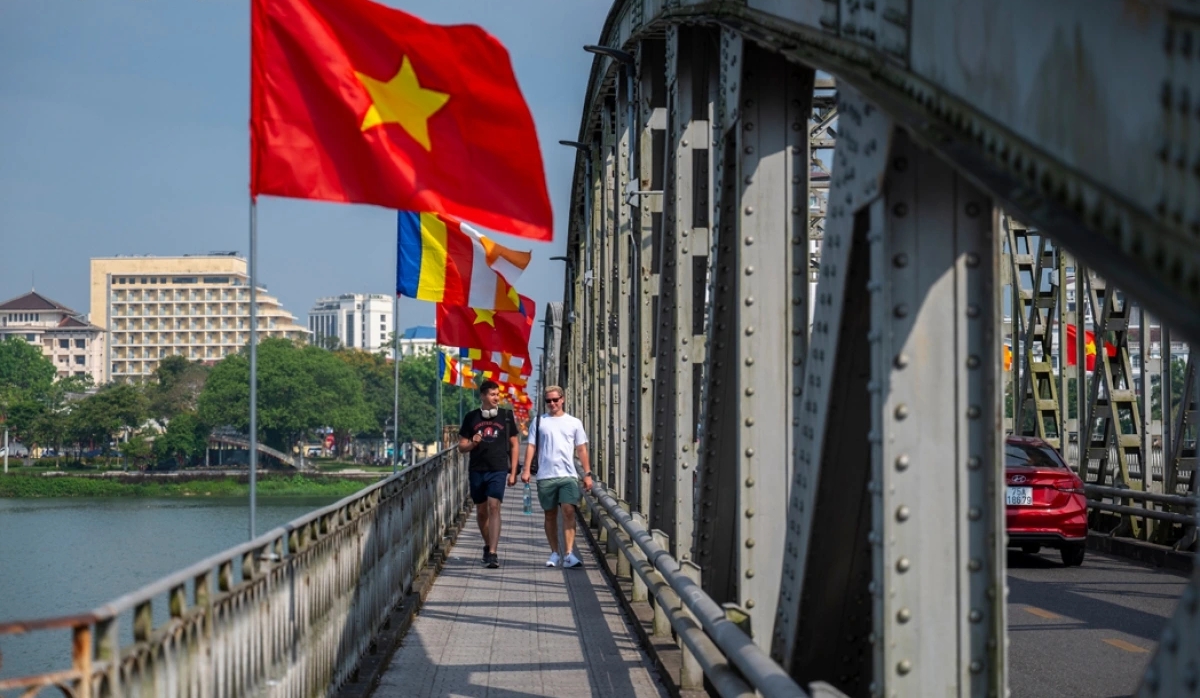 Cầu Trường Tiền rực rỡ cờ Tổ quốc và cờ Phật giáo