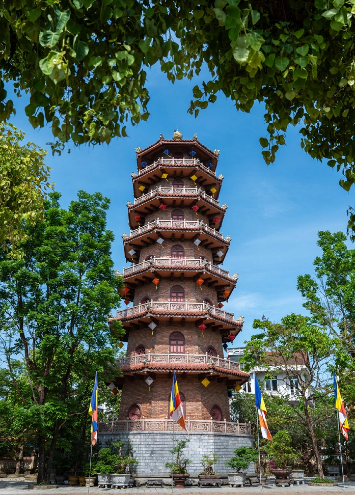 Bảo tháp ở chùa Từ Đàm được trang hoàng cờ và đèn cũng như vệ sinh sạch sẽ đón ngày rước Phật từ chùa Diệu Đế lên
