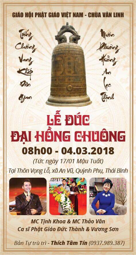 Để tạo nhân duyên cho quý Phật Tử gieo duyên lành với ngôi Tam Bảo. Sư Thầy trụ trì chùa Vân Linh (chùa sổ), thôn Vọng Lỗ, xã An Vũ, Huyện Quỳnh phụ, tỉnh Thái Bình mở Đại lễ Đúc Đại Hồng Chuông ( nặng trên 1.000( một nghìn)kg ) tại nơi khuôn viên chùa nhà.Vào hồi 8h15 ngày Chủ Nhật 17/1/năm Mậu Tuất, ngày 4/3/2018 dương lịch.