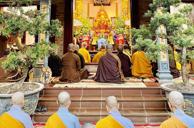 Chư tôn đức Tăng, Ni vân tập làm lễ sái tịnh, tụng kinh chú nguyện trước Tổ đường chùa Bình Thành