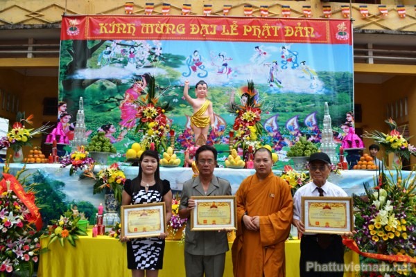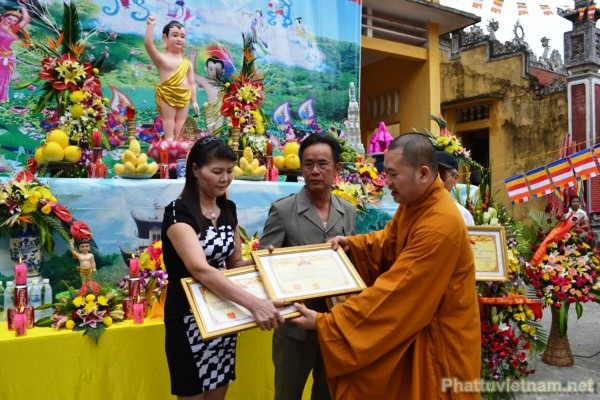 Cũng trong không khí hoan hỷ của buổi lễ, ĐĐ. Thích Giác Nghĩa đã trao bằng tuyên dương công đức cho một số Phật tử là cá nhân, tập thể tiêu biểu đã cúng dáng, đóng bè, tập phúc cho việc xây dựng ngôi Tổ đường chùa Minh Quang trong thời gian vừa qua, mặc dù đến nay ngôi Tổ đường vẫn đang từng bước được hoàn thiện.