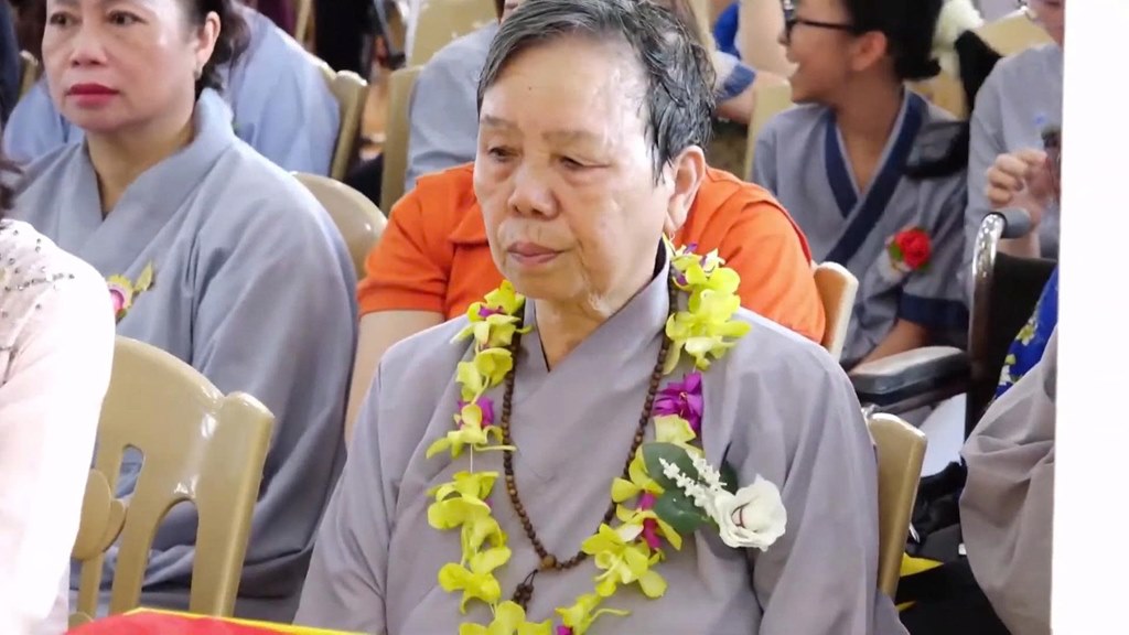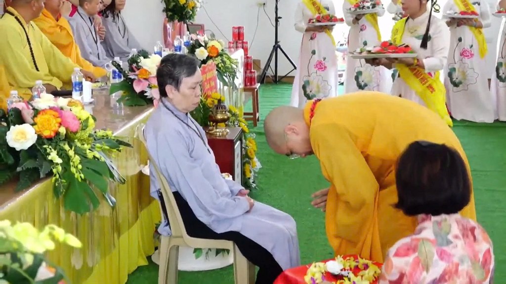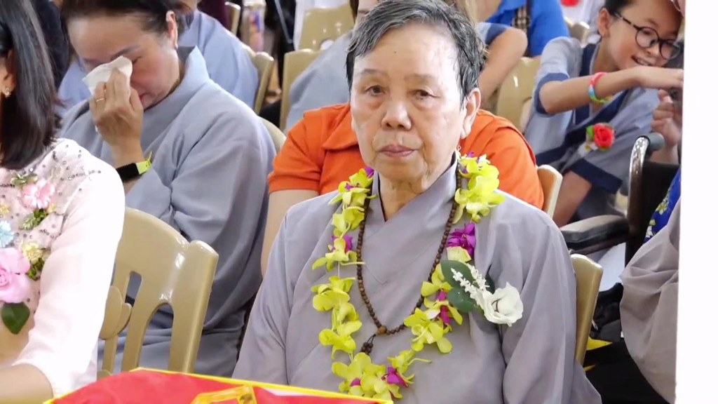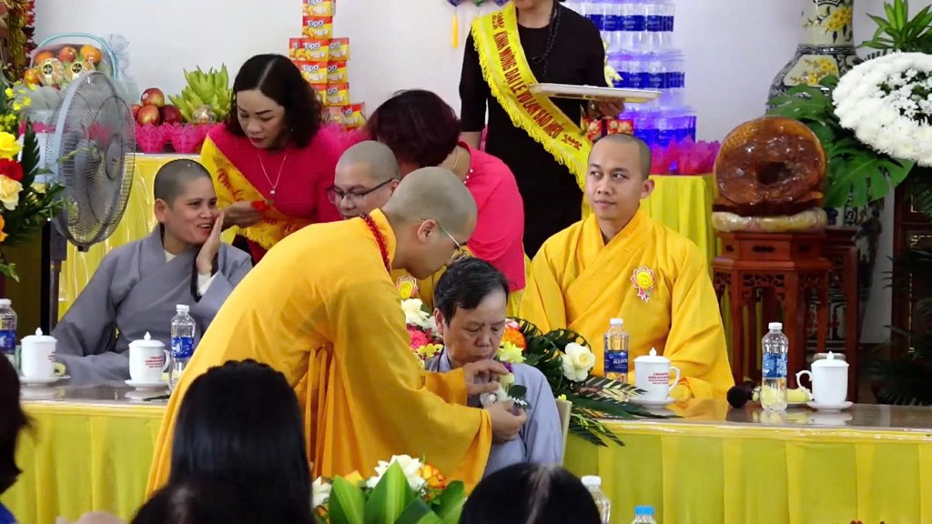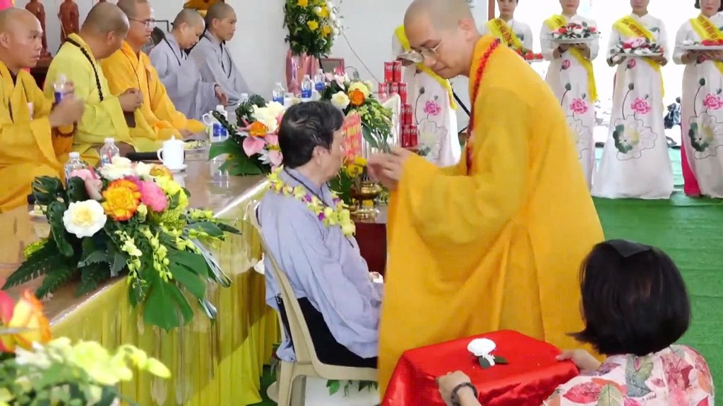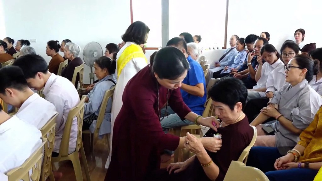 Đại đức Thích Nhựt Phú cài hoa hồng cho thân mẫu