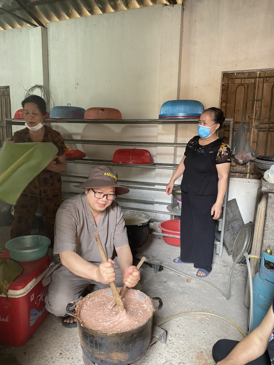 ĐĐ. Thích Giác Nghĩa cùng các Phật tử làm bánh đúc gửi tới bà con đang thực hiện cách ly y tế tại huyện Yên Mỹ, tỉnh Hưng Yên