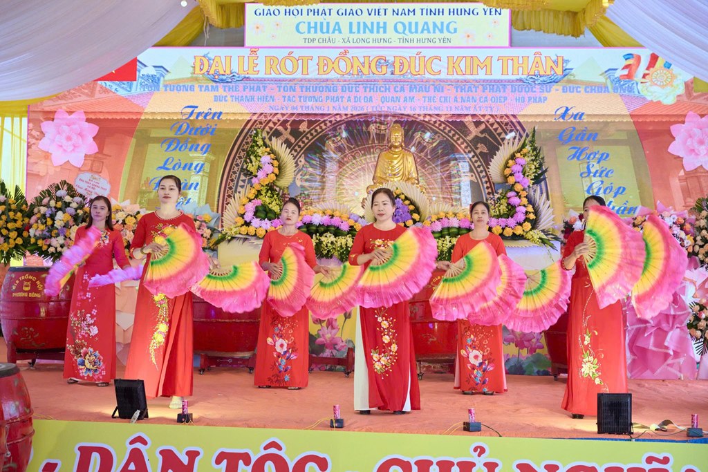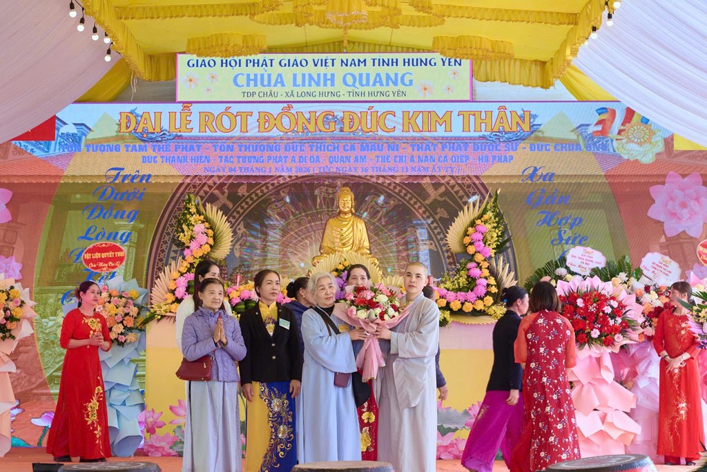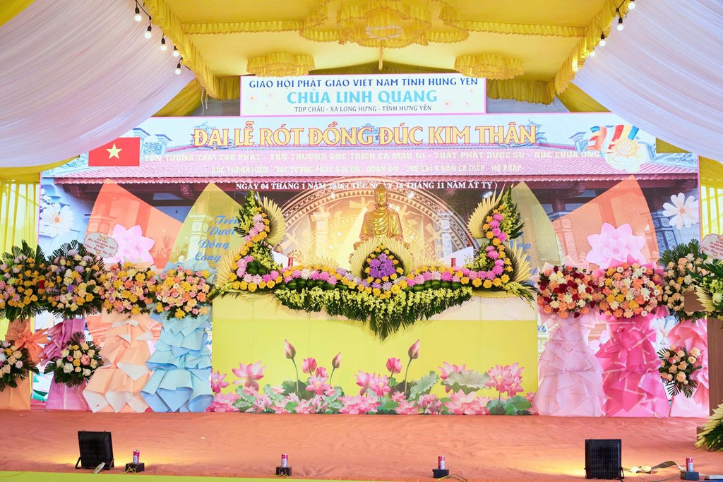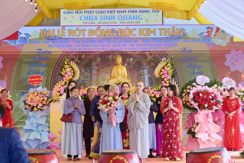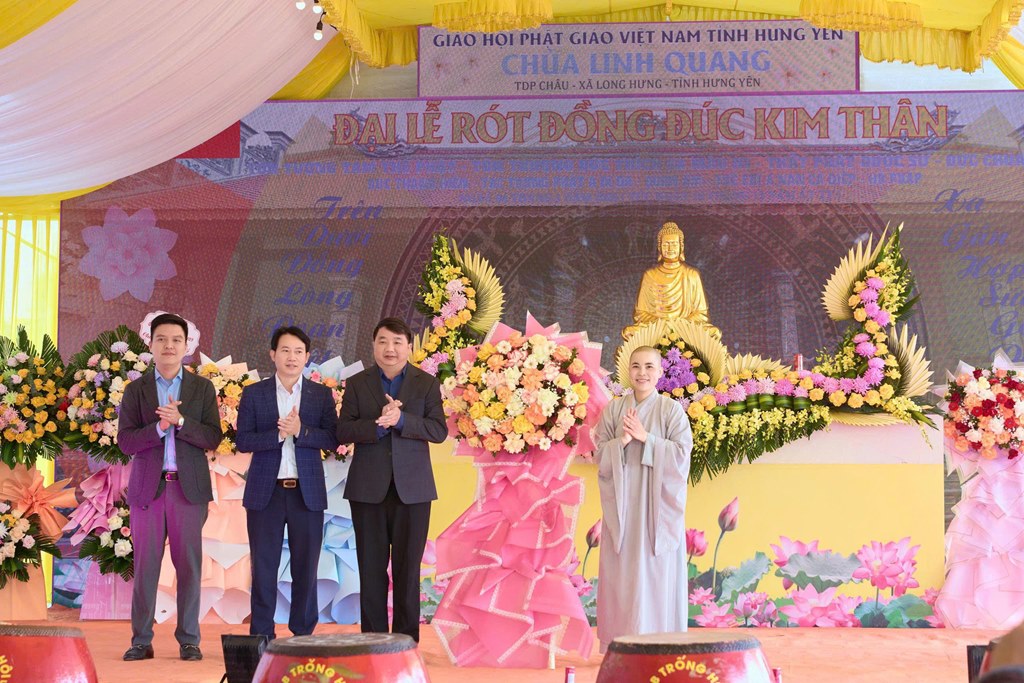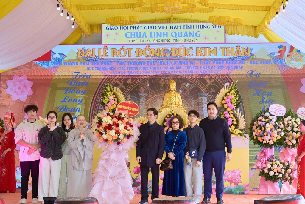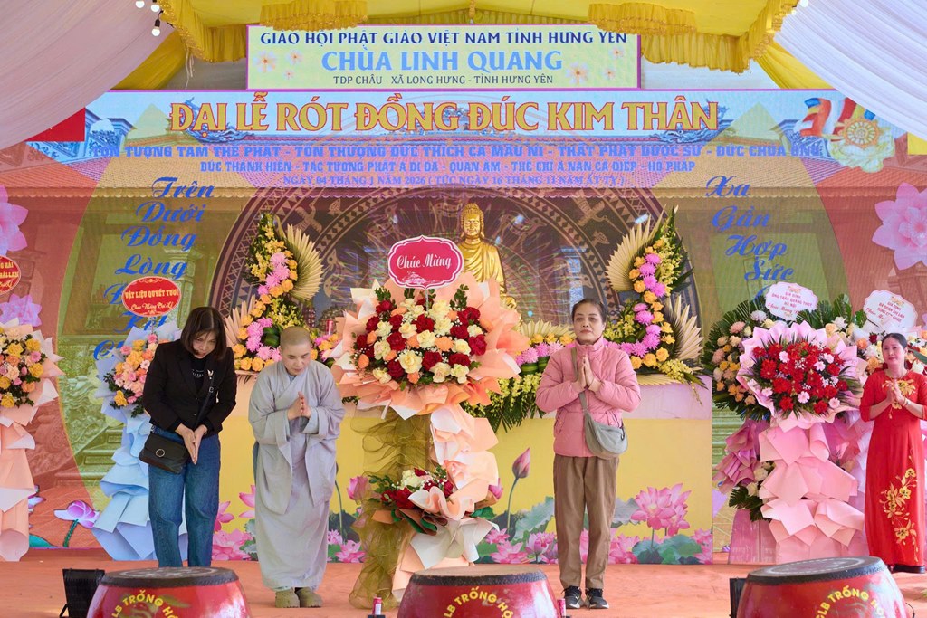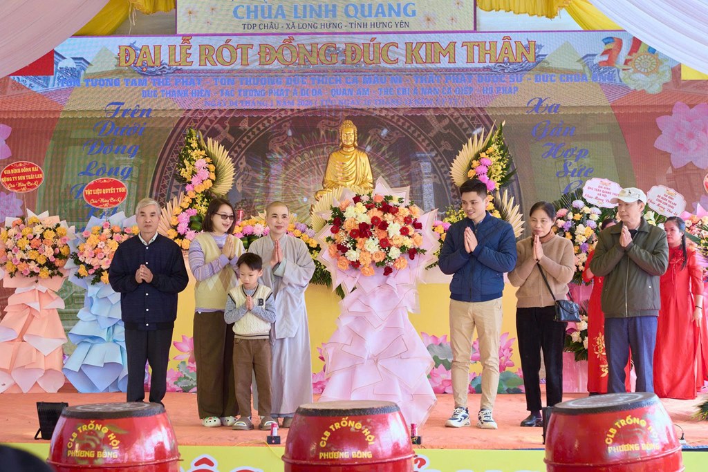 Nhân kỷ niệm khánh đản Đức Phật A Di Đà, sáng ngày 04/01/2026 (Nhằm ngày 16/11 năm Ất Tỵ), tại chùa Linh Quang (Tổ dân phố Châu, xã Long Hưng, tỉnh Hưng Yên) đã long trọng diễn ra Đại lễ rót đồng đúc hơn 13 tôn tượng kim thân Đức Phật, Bồ Tát, Hộ Pháp và Thánh Tăng.