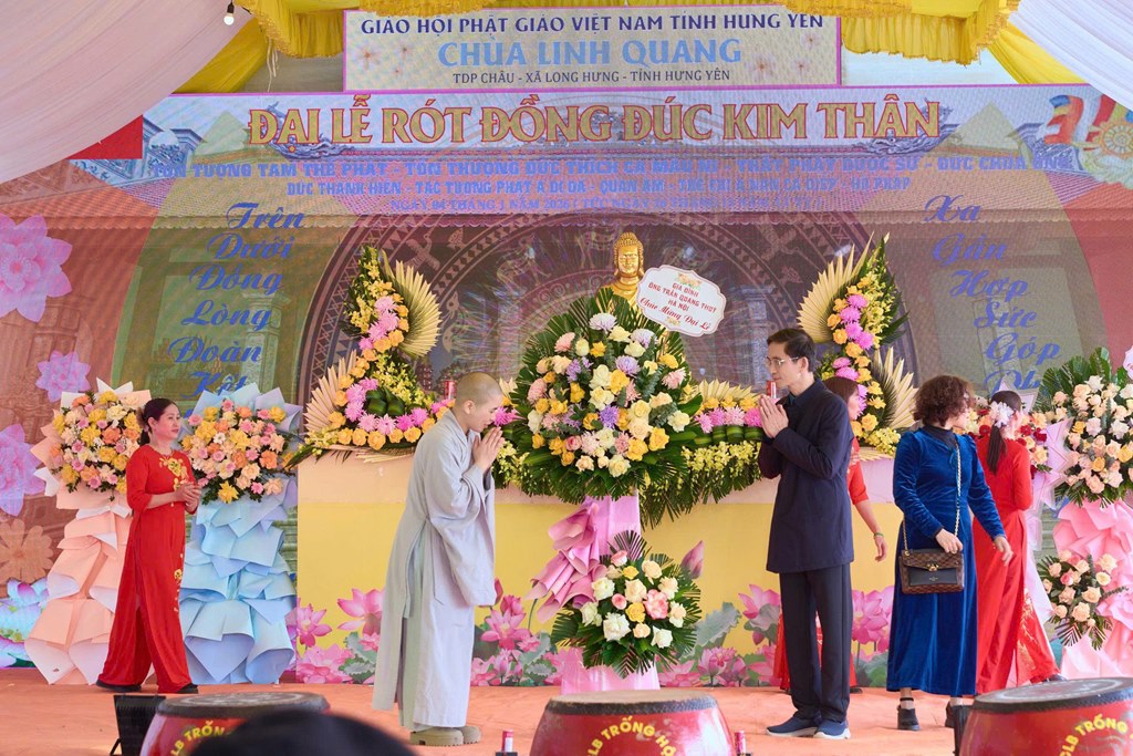Sau nghi thức niệm Phật cầu gia bị, ông: Đoàn Khởi, thay mặt cho Ban tổ chức đã lên tuyên đọc Diễn văn khai mạc đại lễ rót đồng đúc kim thân tôn tượng chư Phật, Bồ tát tại chùa Linh Quang. Chùa Linh Quang có diện tích rất nhỏ hẹp, nằm ở khu Châu, thôn Châu, thị trấn Hưng Nhân, huyện Hưng Hà, tỉnh Thái Bình (cũ), nay thuộc tổ dân phố Châu, xã Long Hưng, tỉnh Hưng Yên, là ngôi chùa cổ có từ lâu đời, từng gắn bó mật thiết với đời sống tinh thần, tâm linh của nhân dân địa phương. Chùa được xây dựng từ rất sớm, trở thành trung tâm sinh hoạt văn hóa, tín ngưỡng của nhân dân. Chùa theo hệ phái Bắc Tông, với kiến trúc đặc trưng của các ngôi chùa thuộc vùng đồng bằng Duyên hải Bắc Bộ. Trải qua biến thiên thăng trầm, sự phong hóa của thời gian và lịch sử, ngôi Đại Hùng Bảo Điện của chùa đã bị xuống cấp trầm trọng. Do vậy, Sư cô Thích Diệu Minh đã cùng chính quyền địa phương phát tâm đứng kêu gọi các nhà hảo tâm, các mạnh thường quân, các Phật tử, bà con xa quê phát tâm công đức tịnh tài, tịnh vật để tôn tạo lại ngôi Đại Hùng Bảo Điện chùa Linh Quang và các công trình phụ trợ.
