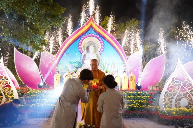 Qua đây, Hòa thượng cũng đã tán thán công đức của Thượng tọa trụ trì trong việc tổ chức ra đêm hội hoa đăng đầy quy mô này. Trong đêm hội này, việc thắp lên ngọn đèn, chính là biểu trưng cho ánh sáng trí tuệ hào quang của Đức Phật. Phật giáo quan trọng hai chữ “Phúc” và “Tuệ”. Đức Phật là bậc lưỡng túc tôn, tức là bậc trí tuệ và phúc đức vẹn toàn tròn trịa. Hành động thắp lên ngọn nến trong đêm hội hoa đăng chính là để khơi dậy nguồn tâm trí tuệ, mở mang Phật tâm của mỗi người. Nguồn ánh sáng đi tới đâu, phá tan đi vô minh hắc ám nơi đó. Trí tuệ của Phật tỏ bày thì chúng sinh giác ngộ. Chính vì vậy, Hòa thượng mong rằng “Chúng ta hãy thắp sáng ngọn nến đó bằng trái tim của mình để mọi người luôn luôn có Phật hiện tiền. Có Phật hiện tiền thì ma chướng sẽ bị tiêu tan. Có Phật hiện tiền thì làm mọi công việc luôn được thành tựu trong tuệ giác. Có Phật hiện tiền thì sống trong sự tỉnh thức, yêu thương và tất cả những thói hư, tật xấu đều tiêu tan. Nếu chúng ta làm được như vậy thì chúng ta ngồi trong pháp hội này, ngồi trong Đêm hội Hoa đăng này mới thực sự có ý nghĩa“.