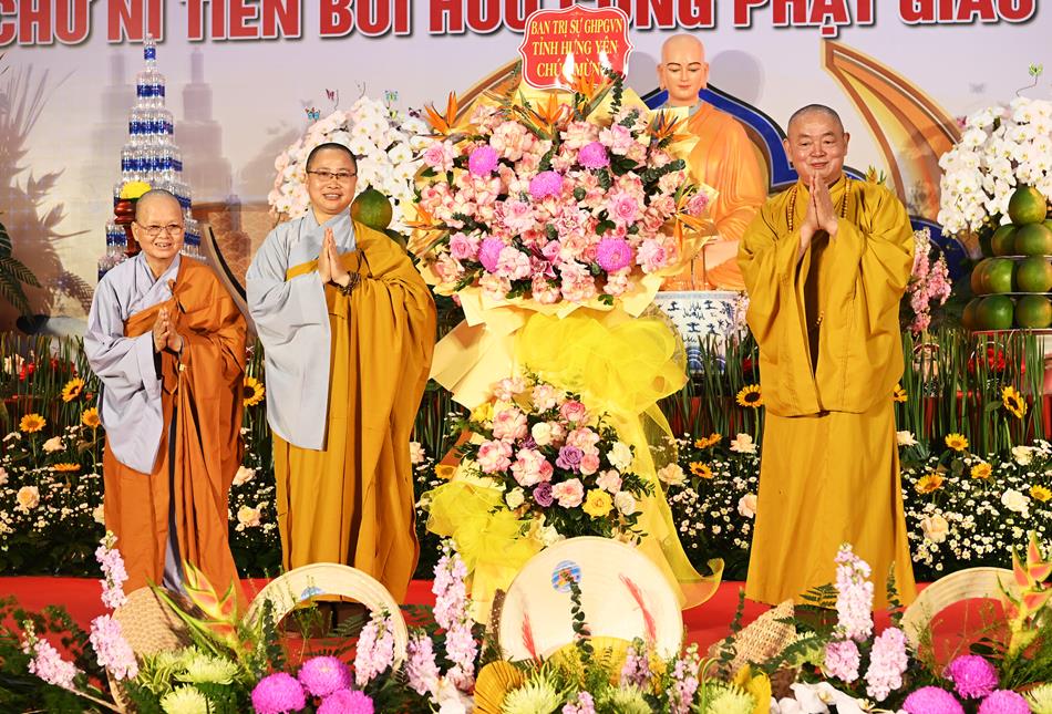 Ban tổ chức cũng đón nhận những lẵng hoa của Ban tri sự GHPGVN tỉnh Hưng Yên và các ban nghành của tỉnh, chính quyền địa phương sở tại chúc mừng.