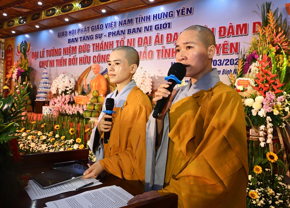 Tiếp đó, Ni sư Thích Đàm Hằng đã cung tuyên tiểu sử của Đức Thánh Tổ, ôn lại hành trình cầu đạo kiên trì của Di Mẫu Kiều Đàm khi xưa, vượt qua mọi gian lao để được dự vào hàng ngũ Tăng già. Ni sư Thích Đàm Thính đại diện Ni giới tỉnh nhà dâng lời tưởng niệm, bày tỏ lòng tri ân vô hạn đối với bậc Mẫu nghi trí đức vẹn toàn.