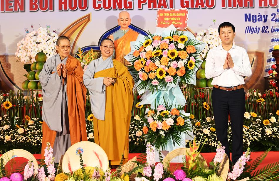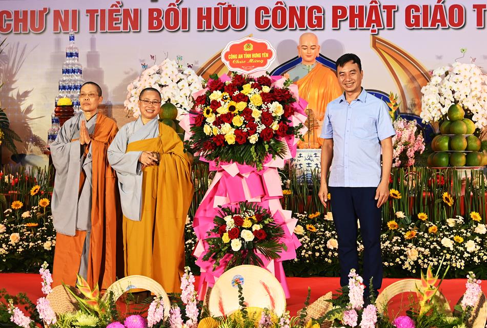 Ban tổ chức cũng đón nhận những lẵng hoa của Ban tri sự GHPGVN tỉnh Hưng Yên và các ban nghành của tỉnh, chính quyền địa phương sở tại chúc mừng.