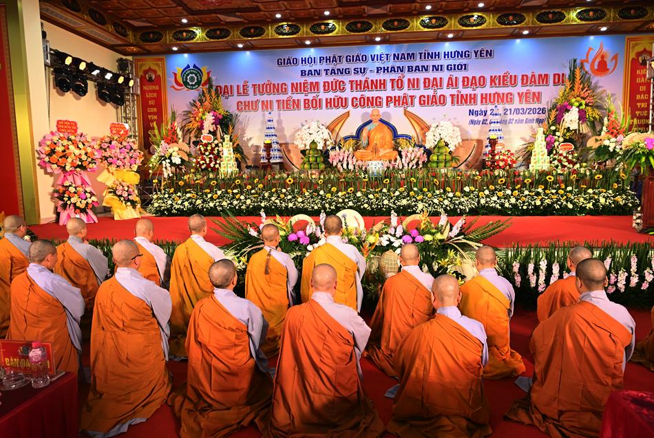 Sáng ngày 21 tháng 3 năm 2026 (03/2/Bính Ngọ), tại chùa Thánh Long (phường Trần Lãm, tỉnh Hưng Yên), Phân ban Ni giới GHPGVN tỉnh Hưng Yên long trọng tổ chức Đại lễ tưởng niệm Đức Thánh Tổ Ni Đại Ái Đạo Kiều Đàm Di và chư Tôn đức Ni tiền bối hữu công Phật giáo tỉnh Hưng Yên.