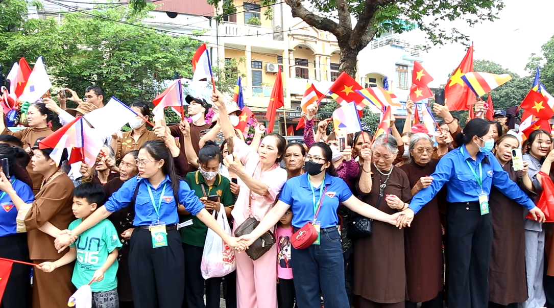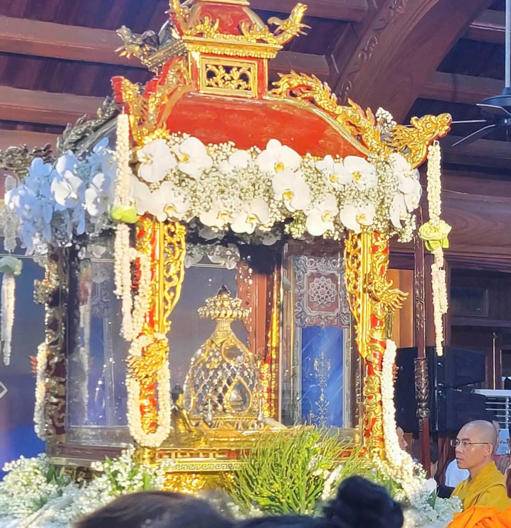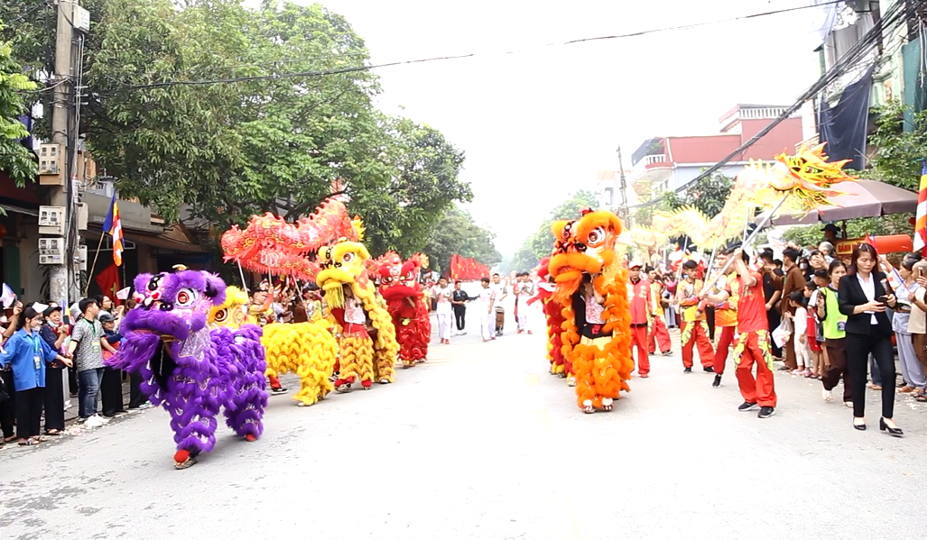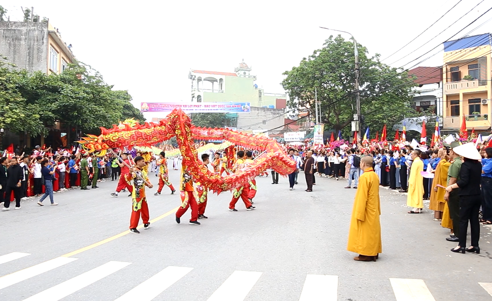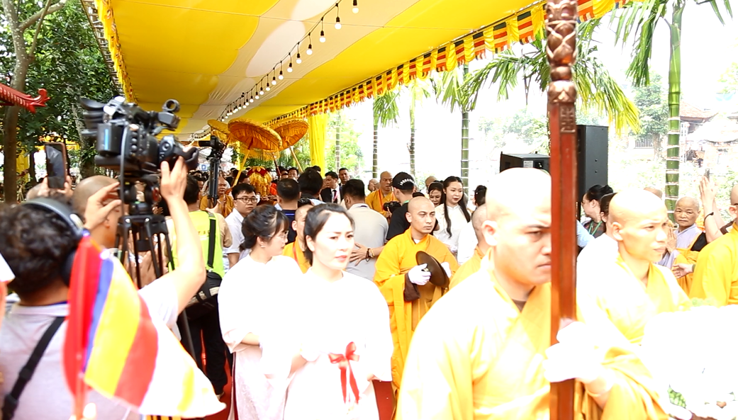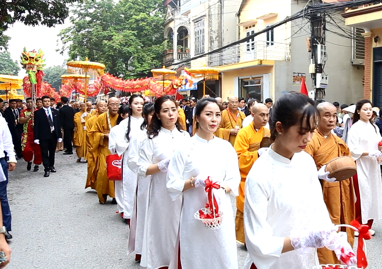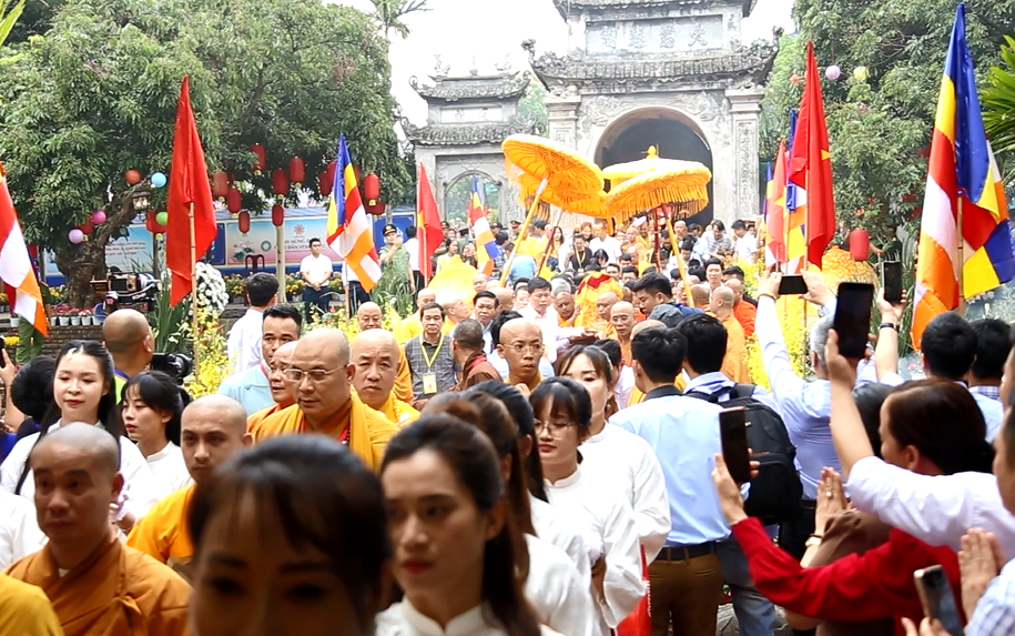 Ngay từ sáng sớm, hàng ngàn người dân và Phật tử đã tập trung tại các tuyến đường dẫn về chùa Chuông, trong không khí trang nghiêm, trật tự. Đoàn rước Xá lợi gồm chư Tôn đức Tăng Ni, đoàn rước lân, đội trống, cùng Phật tử trong trang phục truyền thống chỉnh tề, đã tạo nên một không gian tâm linh thiêng liêng và xúc động.