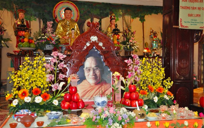 Phụng vị Phượng Ban, Kim Liên, Đồng Đắc, Vĩnh Nghiêm, Giác Minh, Từ Quang, Việt Nam Quốc Tự pháp phái, Tào Động chánh tông, Đệ Lục thế, lãnh tụ Thế Giới & VNPG nội ngoại quốc, thượng TÂM hạ CHÂU hiệu THANH MINH tự TUỆ HẢI tánh Đoàn Công đại TL Hòa thượng Thiền sư Thượng Nhơn giác linh liên toạ hạ.