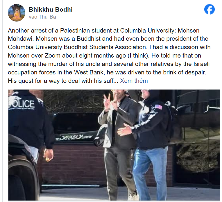 (Một vụ bắt giữ khác đối với một sinh viên Palestine tại Đại học Columbia: Mohsen Mahdawi. Mohsen là một Phật tử và thậm chí từng là chủ tịch của Hiệp hội Sinh viên Phật giáo của Đại học Columbia. Tôi đã có một cuộc thảo luận với Mohsen qua Zoom khoảng tám tháng trước (tôi nghĩ vậy). Anh ấy kể với tôi rằng khi chứng kiến cảnh chú mình và một số người thân khác bị lực lượng chiếm đóng Israel sát hại ở Bờ Tây, anh ấy đã đến bờ vực tuyệt vọng. Hành trình tìm kiếm cách giải quyết nỗi đau khổ của mình cuối cùng đã đưa anh ấy đến với lời dạy của Đức Phật. Trong cuộc gọi Zoom của chúng tôi, Mohsen đã kể với tôi về một dự án mà anh ấy đang ấp ủ: tập hợp những nhà tư tưởng pháp lý, trí thức công chúng, luật gia và những người trong Liên hợp quốc được lựa chọn để đưa ra các kế hoạch cải cách cơ cấu quản lý của Liên hợp quốc để các cường quốc toàn cầu lớn không còn có thể ngăn cản các nghị quyết quan trọng bằng quyền phủ quyết và khả năng gây sức ép với các quốc gia khác. Thật đáng mừng khi thấy anh ấy có sự ủng hộ ở đây từ Thượng nghị sĩ Bernie Sanders.)