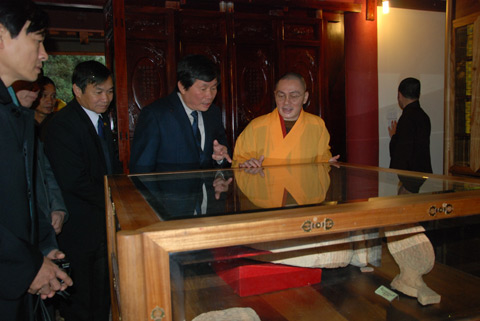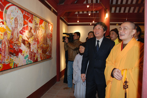 Chư tôn đức cùng quý vị quan khách đã tham dự lễ cắt băng khai mạc triển lãm mỹ thuật Phật giáo và phòng trưng bày cổ vật Phật giáo tại chùa Thiên Trù