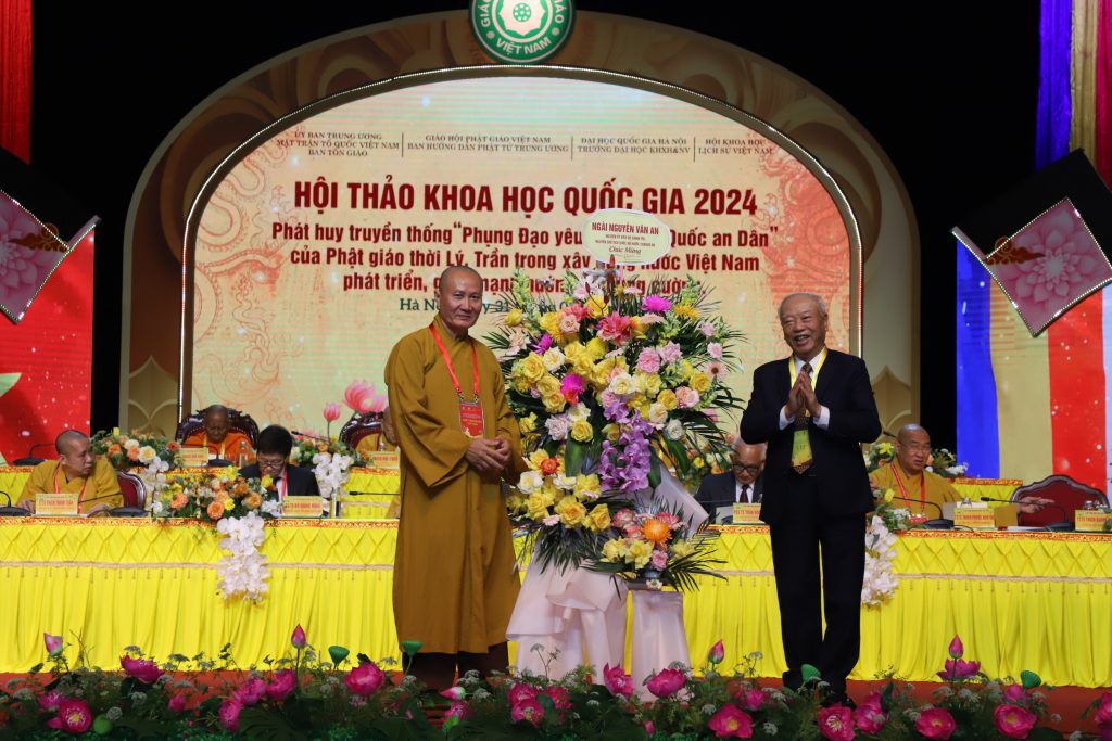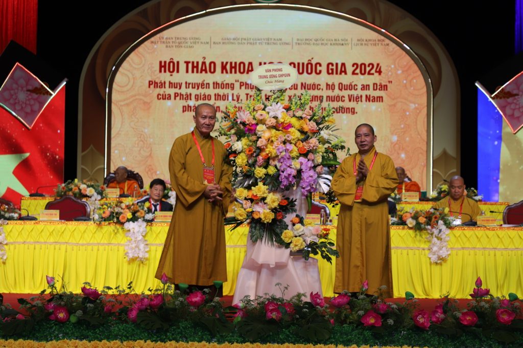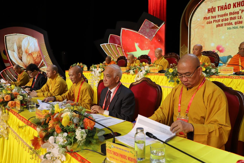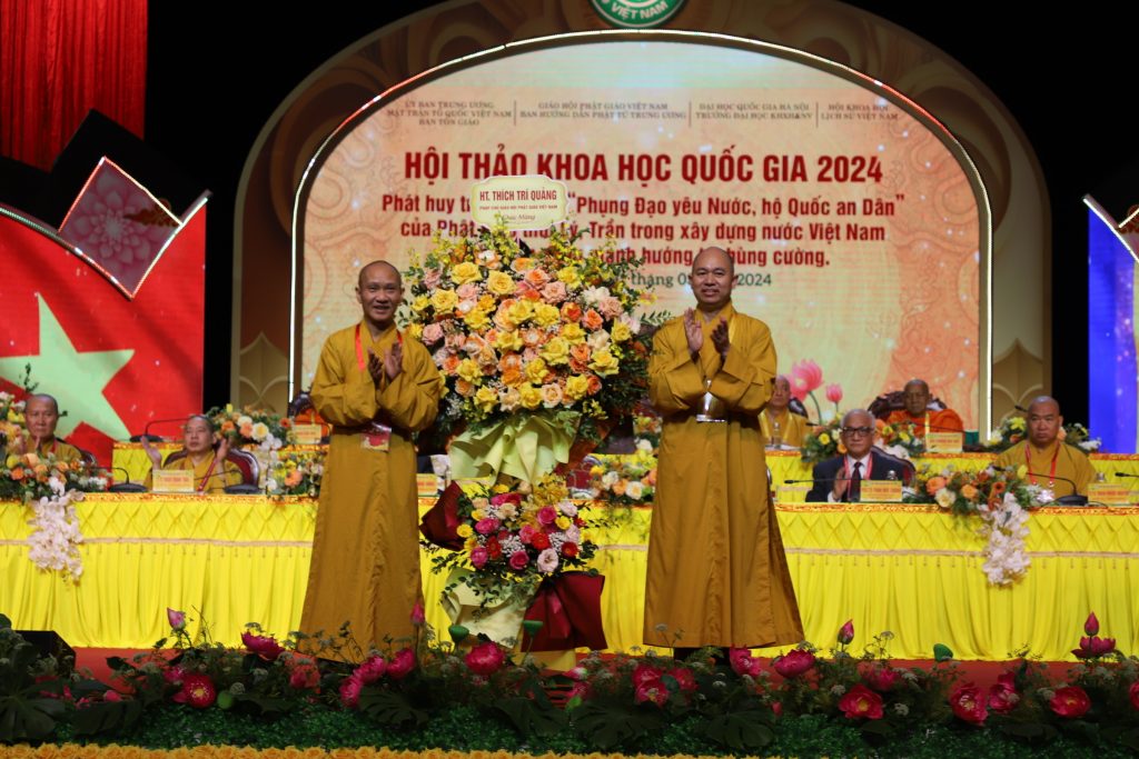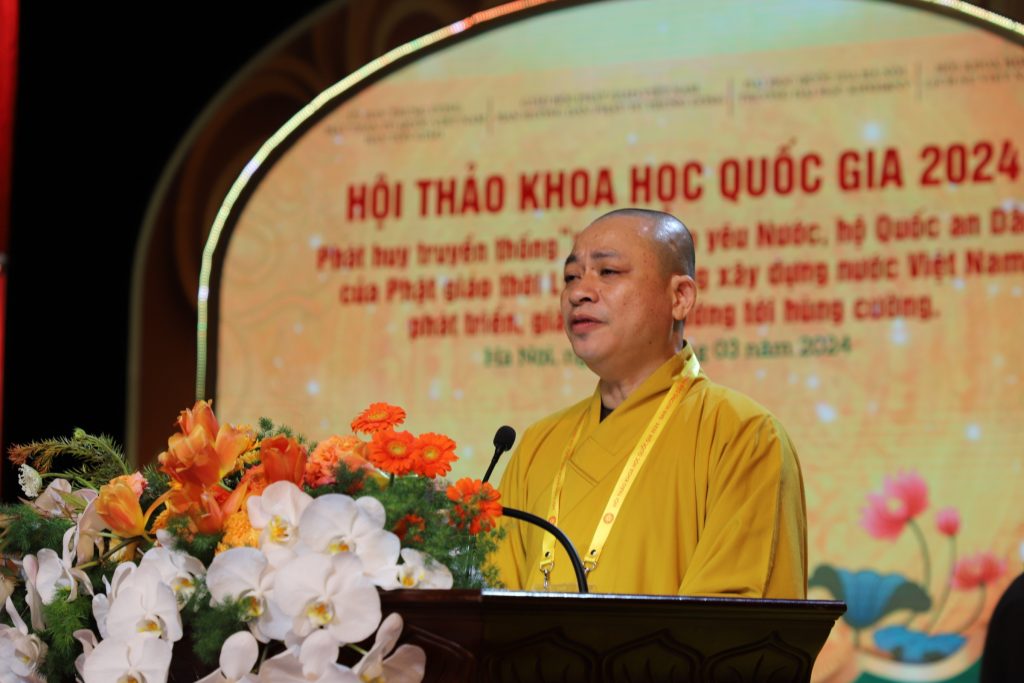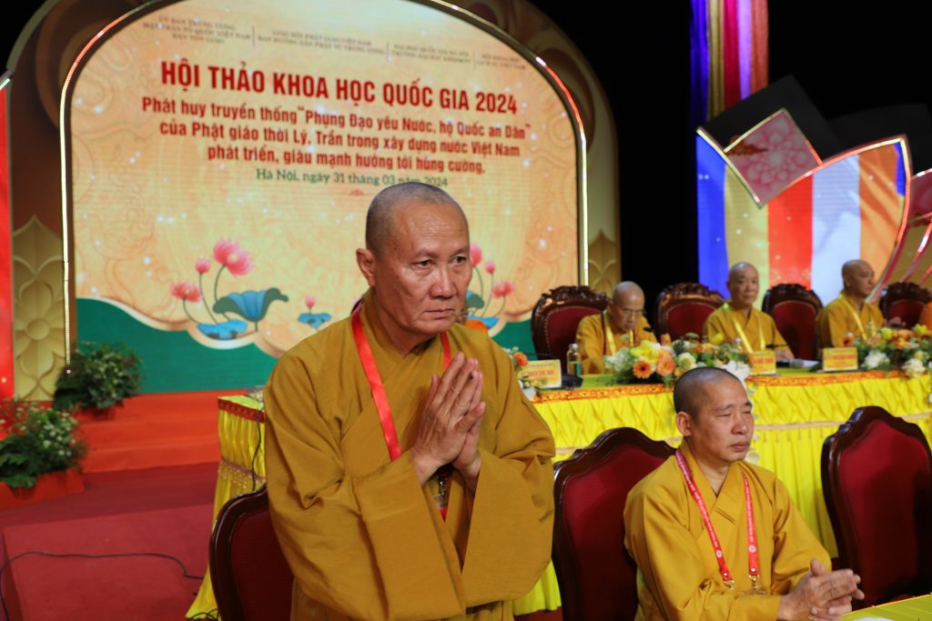 TT.Thích Đức Thiện – Phó chủ tịch HĐTS GHPGVN – Tổng thư ký HĐTS GHPGVN đọc thư chúc mừng của Đức pháp chủ GHPGVN tới Hội thảo. Đức pháp chủ GHPGVN nhấn mạnh: “Trước hết, tôi tán dương công đức Ban Hướng dẫn Phật tử Trung ương Giáo hội Phật giáo Việt Nam đã tổ chức Hội thảo khoa học quốc gia với chủ đề “Phát huy truyền thống “Phụng Đạo yêu Nước, hộ Quốc an Dân” của Phật giáo thời kỳ Lý, Trần trong xây dựng nước Việt Nam phát triển, giàu mạnh hướng tới hùng cường”.