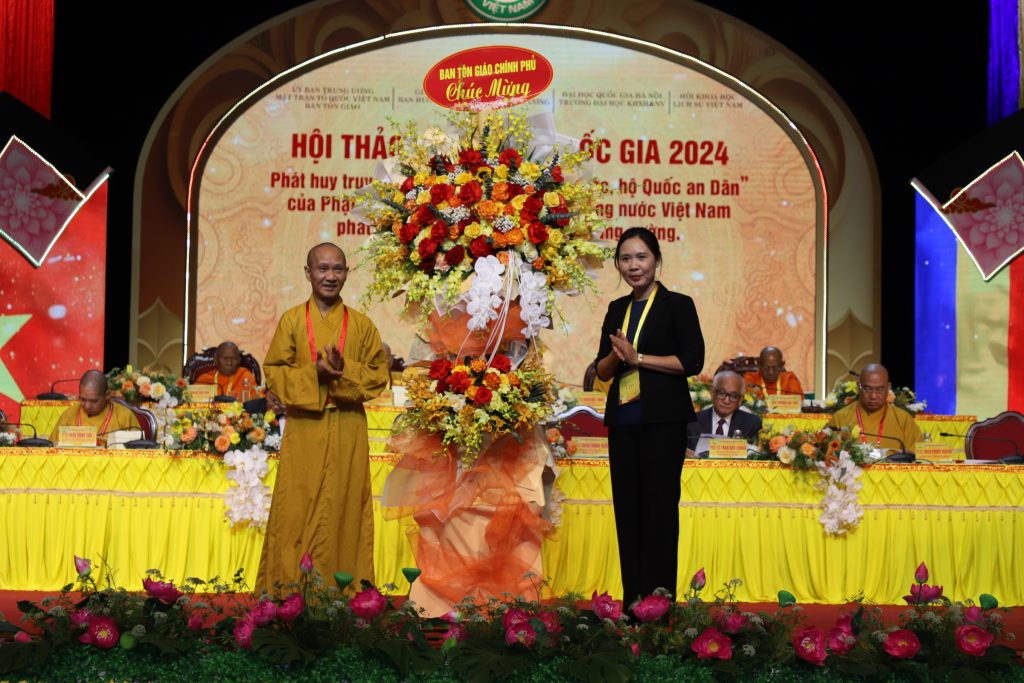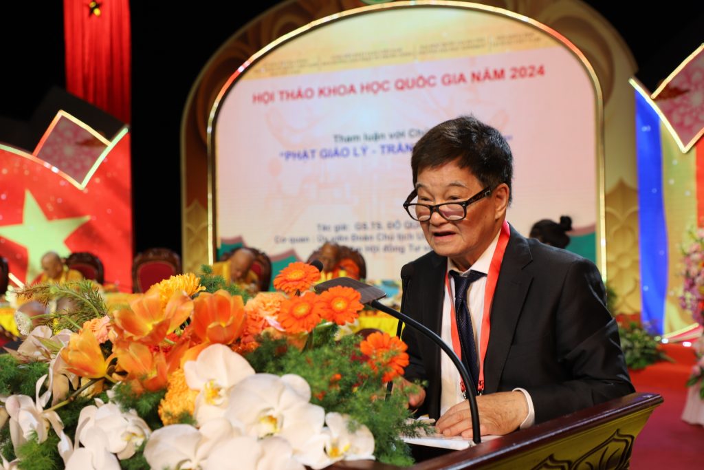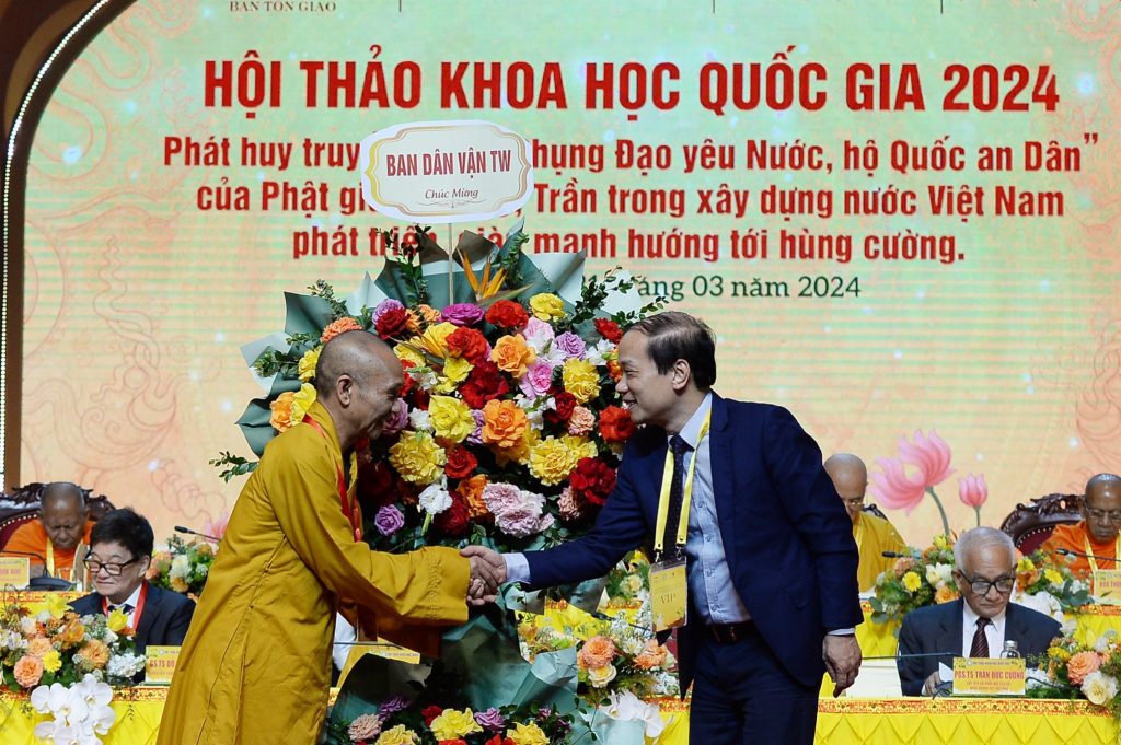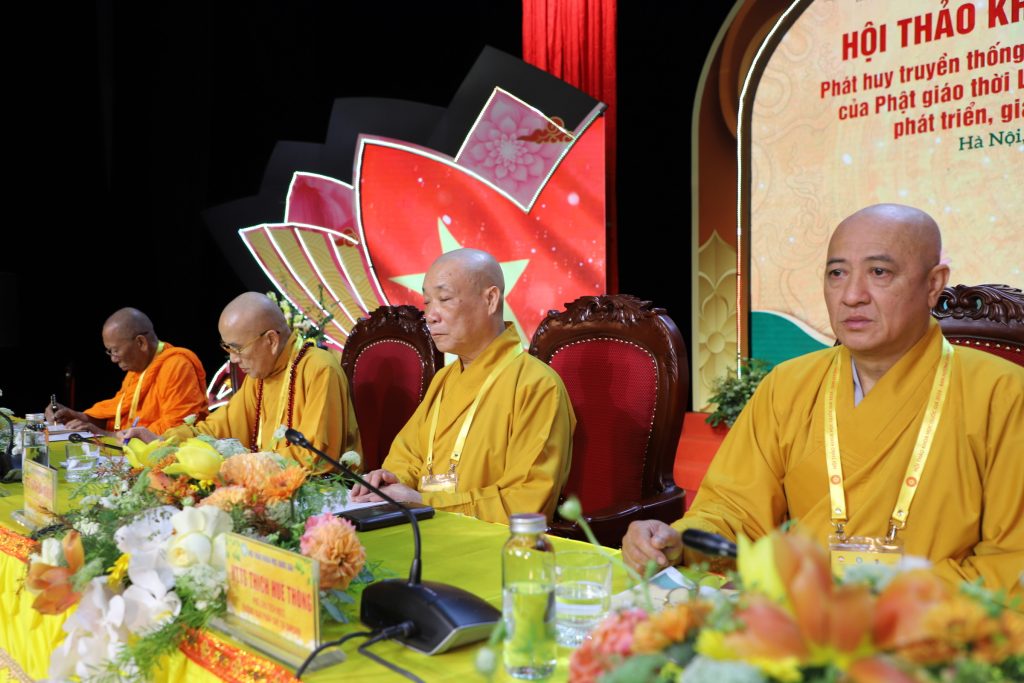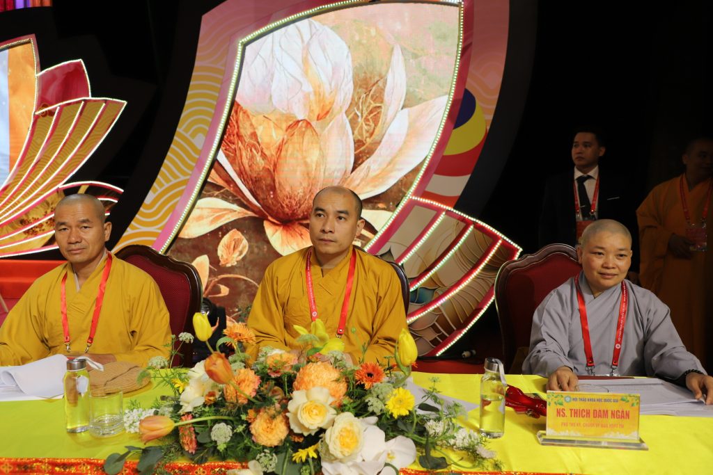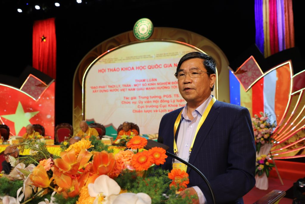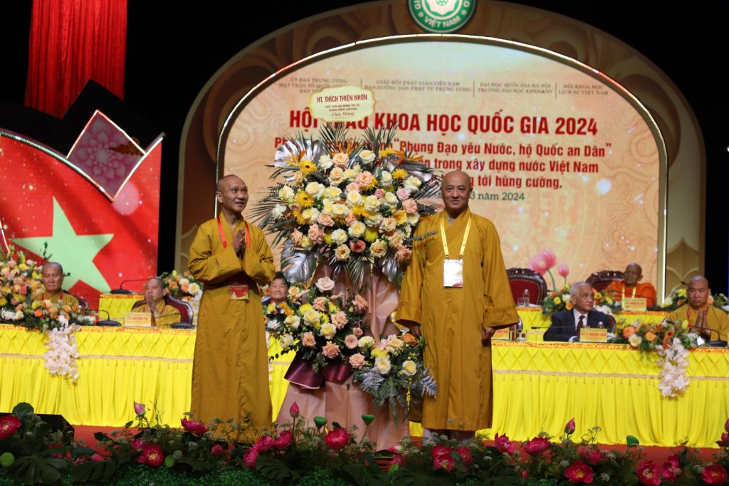 TT.Thích Đức Thiện – Phó chủ tịch HĐTS GHPGVN – Tổng thư ký HĐTS GHPGVN đọc thư chúc mừng của Đức pháp chủ GHPGVN tới Hội thảo. Đức pháp chủ GHPGVN nhấn mạnh: “Trước hết, tôi tán dương công đức Ban Hướng dẫn Phật tử Trung ương Giáo hội Phật giáo Việt Nam đã tổ chức Hội thảo khoa học quốc gia với chủ đề “Phát huy truyền thống “Phụng Đạo yêu Nước, hộ Quốc an Dân” của Phật giáo thời kỳ Lý, Trần trong xây dựng nước Việt Nam phát triển, giàu mạnh hướng tới hùng cường”.