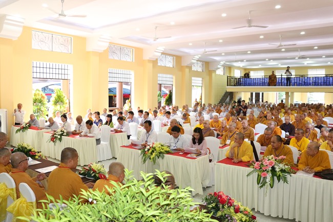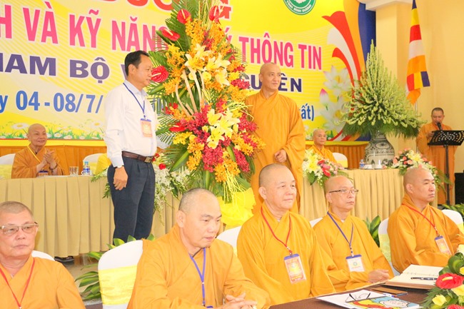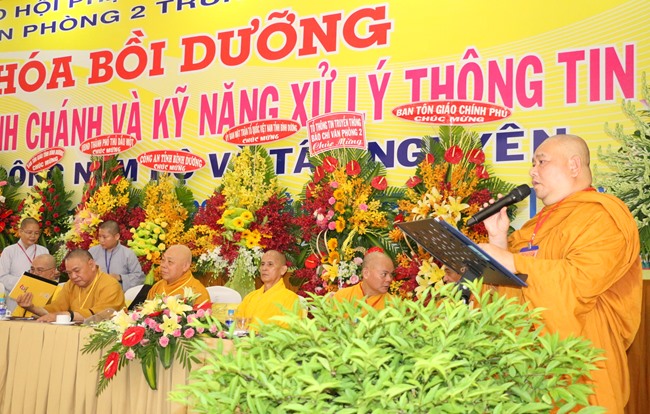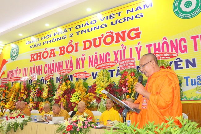 Phát biểu báo cáo công tác tổ chức Khóa Bồi dưỡng Nghiệp vụ hành chánh và Kỹ năng xử lý thông tin do TT. Thích Minh Lực, Phó BTS kiêm Trưởng Ban Thông tin Truyền thông GHPGVN tỉnh Bình Dương: Khóa Bồi dưỡng Nghiệp vụ Hành chánh và kỹ năng xử lý thông tin truyền thông có 314 đại biểu tham dự đại diện cho 10 tỉnh thành miền Đông Nam Bộ và Tây Nguyên.