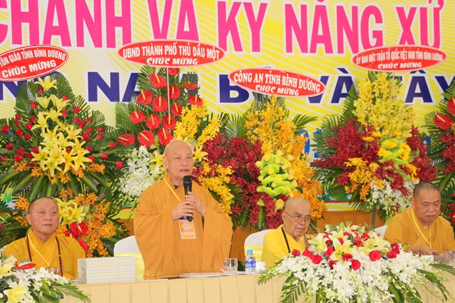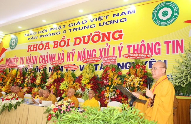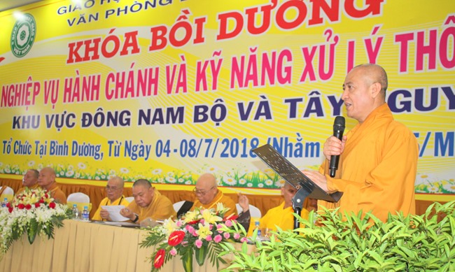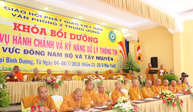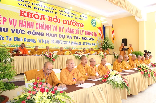 Phát biểu khai mạc, HT.Thích Huệ Thông, Phó Tổng Thư ký kiêm Chánh Văn Phòng II TƯ GH, Trưởng BTS GHPGVN tỉnh Bình Dương đã nói: Được sự chấp thuận của Ban Thường trực HĐTS GHPGVN, được sự cho phép của Ban Tôn giáo- Sở Nội vụ tỉnh, Ban Trị sự Phật giáo tỉnh Bình Dương phối hợp với Văn Phòng II TWGH tổ chức Khóa Bồi dưỡng Nghiệp vụ Hành chánh và Kỹ năng xử lý thông tin cho các tỉnh thành miền Đông Nam Bộ và Tây Nguyên với sự tham dự của 10 đơn vị tỉnh thành và hơn 400 đại biểu tham dự khóa tập huấn được diễn ra trong 05 ngày, từ ngày 04-08/07/2018 (nhằm ngày 21-25/05/Mậu Tuất).