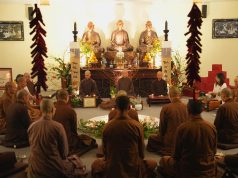Trước khi dùng bữa, đối trước Phật đài trang nghiêm, dưới sự chủ trì và hướng dẫn của Hòa thượng trụ trì Thích Bảo Nghiêm – Phó Chủ tịch Hội đồng Trị sự GHPGVN, Trưởng ban Hoằng pháp Trung ương, Trưởng ban Trị sự GHPGVN TP. Hà Nội, các khóa sinh đã thực hiện nghi thức phụng thỉnh Tổ tiên đầy thiêng liêng.
