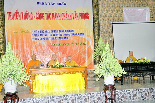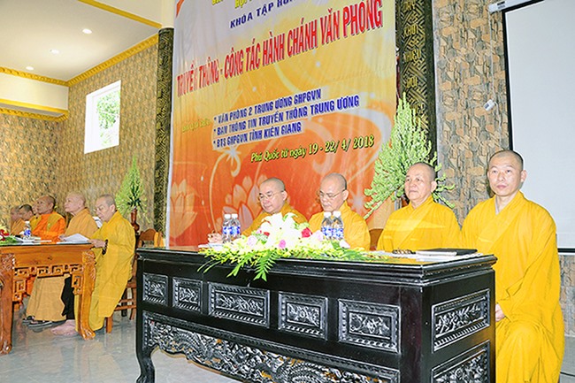 Được biết Khoá tập huấn lần này do Văn phòng 2 TW GHPGVN, Ban TT TT TW và BTS GHPGVN tỉnh Kiên Giang phối hợp tổ chức. Sau phần tuyên bố lý do và giới thiệu thành phần tham dự, Ban tổ chức cung thỉnh HT Thích Tấn Đạt – UV Thư Ký TW, Phó Ban tổ chức phát biểu tuyên bố khai mạc khoá tập huấn. những lẵng hoa chúc mừng được trao tặng cho BTC – chúc mừng buổi lễ thành công tốt đẹp.