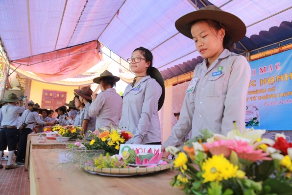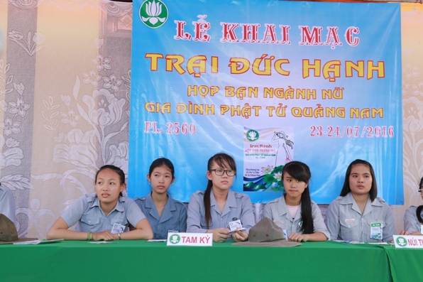 Sau phần nghi lễ theo truyền thống của GĐPT, HTr Như Diệp Lê Thị Thu, Phó trưởng ban ngành Nữ GĐPT Quảng Nam, Trại trưởng trại Đức Hạnh phát biểu khai mạc nhấn mạnh, “Biểu tượng của ngành Nữ là Ngài Quán Thế Âm Bồ Tát, Ngài xuất hiện dưới hình tượng của người nữ thật diệu hiền và ấm áp đầy tình thương yêu. Đối với tổ chức GĐPT tu học tiến bộ là thông qua con đường sinh hoạt, mà cắm trại là một phương tiện để chị em nữ gặp gỡ kết thân, giao lưu sinh hoạt, phát huy sáng kiến, bổ sung kiến thức cho nhau, thúc liễm thân tâm, trao dồi kinh nghiệm để xây dựng ngành Nữ GĐPT Quảng Nam ngày càng vững mạnh.”