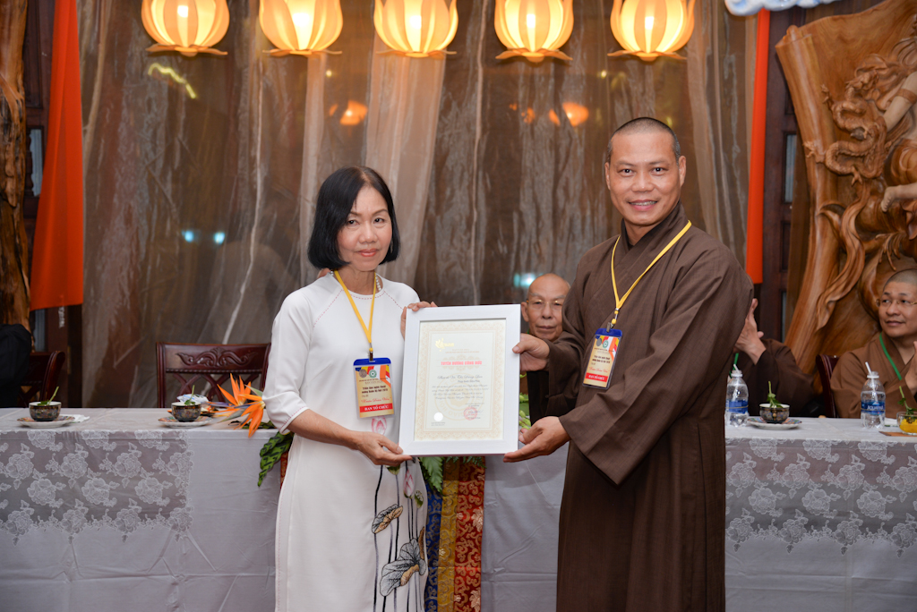 Phật tử Đăng Lan đại diện các nghệ nhân nhận bằng Tuyên dương công đức từ Thượng toạ trưởng Ban tổ chức