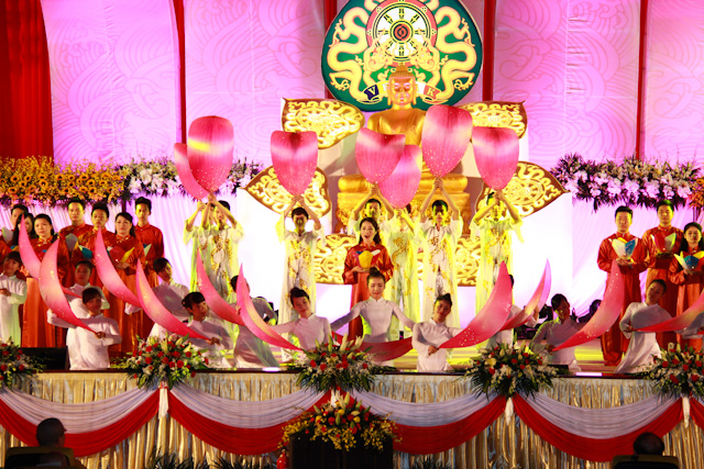 9 giờ, đoàn hợp xướng chào mừng quý đại biểu với nội dung hân hoan chào đón đức Phật ra đời và bay lên vì hòa bình thế giới.