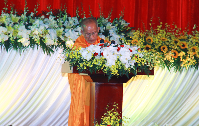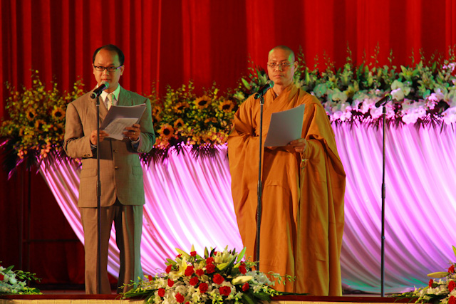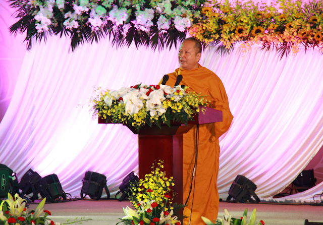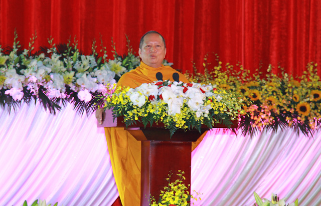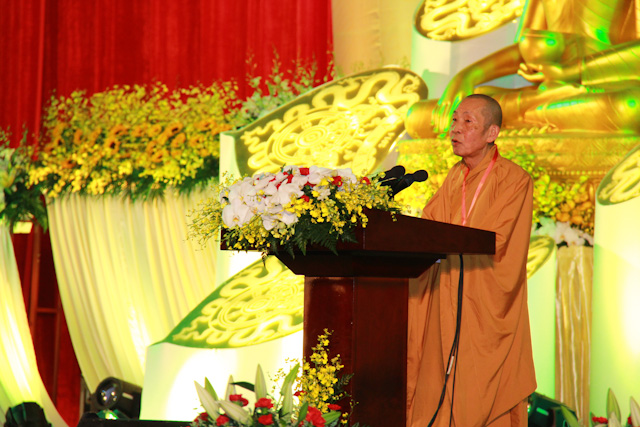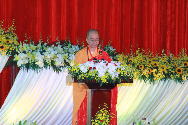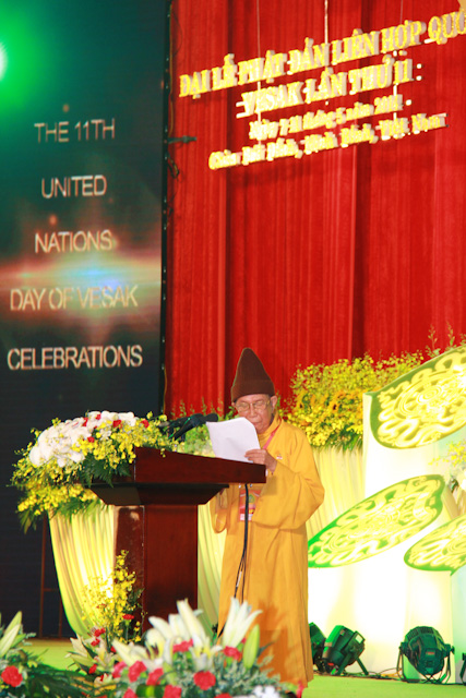 10 gờ 05 phút, HT. Thích Chơn Thiện tuyên đọc diễn văn chào mừng của Ban thường trực HĐTS GHPGVN: “Chúng ta kỷ niệm ngày Lễ Tam hợp – Đản sinh, Thành đạo, Nhập Niết bàn của Đức Phật vào ngày trăng tròn tháng 4 âm lịch, biểu thị một ý nghĩa viên mãn và phổ quát của các lĩnh vực: Từ bi, trí tuệ, hòa bình, giáo dục, văn hóa, nhân bản của loài người mà Đức Phật đã để lại cho chúng ta và nhân loại hơn 25 thế kỷ qua. Cũng chính từ lẽ đó, Đức Phật không những chỉ là một đấng giáo chủ sáng lập Đạo Phật mà còn là một nhà giáo dục, văn hóa, hòa bình, đạo đức, xã hội và Đạo Phật là Đạo Từ bi, Trí tuệ, Hòa bình và Văn hóa văn minh của nhân loại. Do đó, Liên Hiệp Quốc công nhận ngày Vesak, là ngày Lễ hội Tôn giáo quốc tế, mang đậm màu sắc lễ hội văn hóa, đạo đức, hòa bình của nhân loại”.
