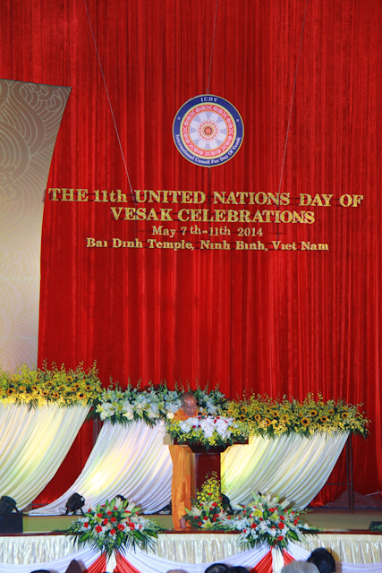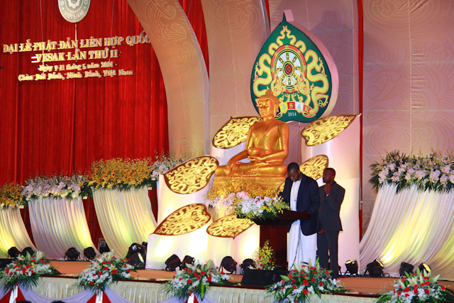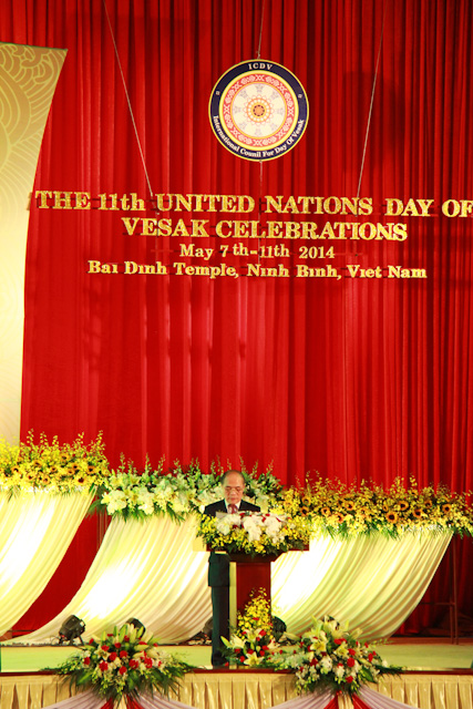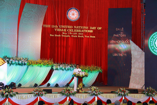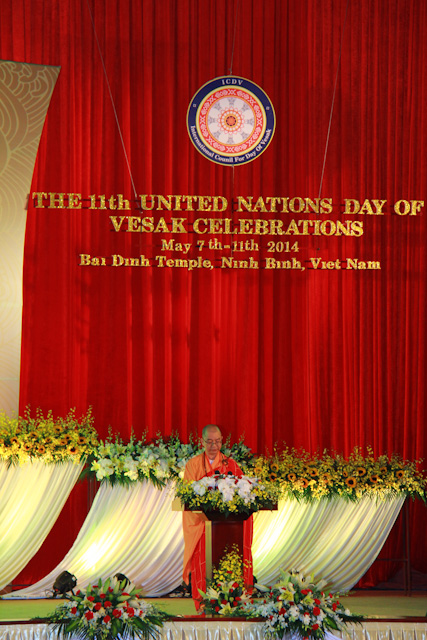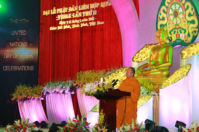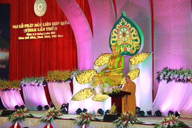 9 giờ 35 phút, HT. Thích Thanh Nhiễu Chủ tịch Ủy ban Tổ chức Quốc tế 2014 tại Việt Nam phát biểu khai mạc. Hòa thượng nhấn mạnh: “Có được ngày trọng đại hôm nay, trước hết được sự đồng thuận của Ủy ban Tổ chức Quốc tế ICDV, đứng đầu là Hòa thượng Brahmapandit và được khẳng định trong tuyên bố tại Bangkok – Thái Lan năm 2013, chấp thuận cho Giáo hội Phật giáo Việt Nam đăng cai tổ chức Đại lễ Phật đản Liên Hiệp Quốc năm 2014 tại Việt Nam. Đây là một sự quan tâm đặc biệt của cộng đồng quốc tế đối với Giáo hội Phật giáo Việt Nam, trong trách nhiệm phát huy tinh thần Đạo Phật, Đạo của Từ bi, Trí tuệ và Hòa bình, tạo sự liên hữu trong ngôi nhà Phật giáo khắp 5 Châu mà Giáo hội Phật giáo Việt Nam là thành viên đã thể hiện tinh thần cao cả ấy trong cộng đồng Phật giáo thế giới và khu vực trong thời kỳ hội nhập, phát triển toàn cầu”.