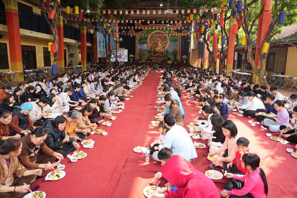 Trước giờ phút chia tay, đại chúng cùng quây quần bên nhau trong bữa cơm chay thân mật đầu tiên của năm mới – bữa cơm chan chứa tình thầy trò, tình huynh đệ. Không chỉ là bữa ăn nuôi dưỡng thân thể, đó còn là sự tiếp nối đẹp đẽ của văn hóa sum họp, của nếp sống gia đình và truyền thống tâm linh Phật giáo: cùng ngồi lại, cùng lắng nghe, cùng chia sẻ và nuôi dưỡng hiểu thương trong từng cử chỉ nhỏ.