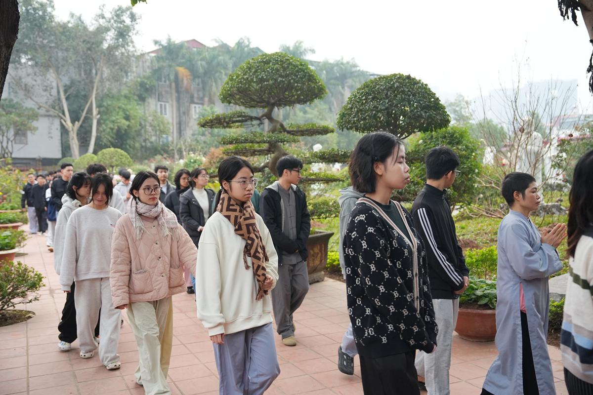 Sau đó, dưới sự hướng dẫn từ bi của Hòa thượng Thích Bảo Nghiêm, toàn thể khóa sinh lặng lẽ bước vào thời khóa thiền hành, thong dong dạo quanh khuôn viên chùa và hướng về vườn Quan Âm thanh tịnh. Không gian như lắng lại trong từng bước chân chậm rãi, vững chãi. Mỗi bước đi là một hơi thở chính niệm, là một lần trở về với thân tâm đang có mặt. Trên con đường thiền hành ấy, không còn vội vã hay tìm cầu, chỉ có sự an trú trọn vẹn trong giây phút hiện tại, nương tựa vào tự thân và nuôi dưỡng nguồn năng lượng bình an nơi tâm hồn.