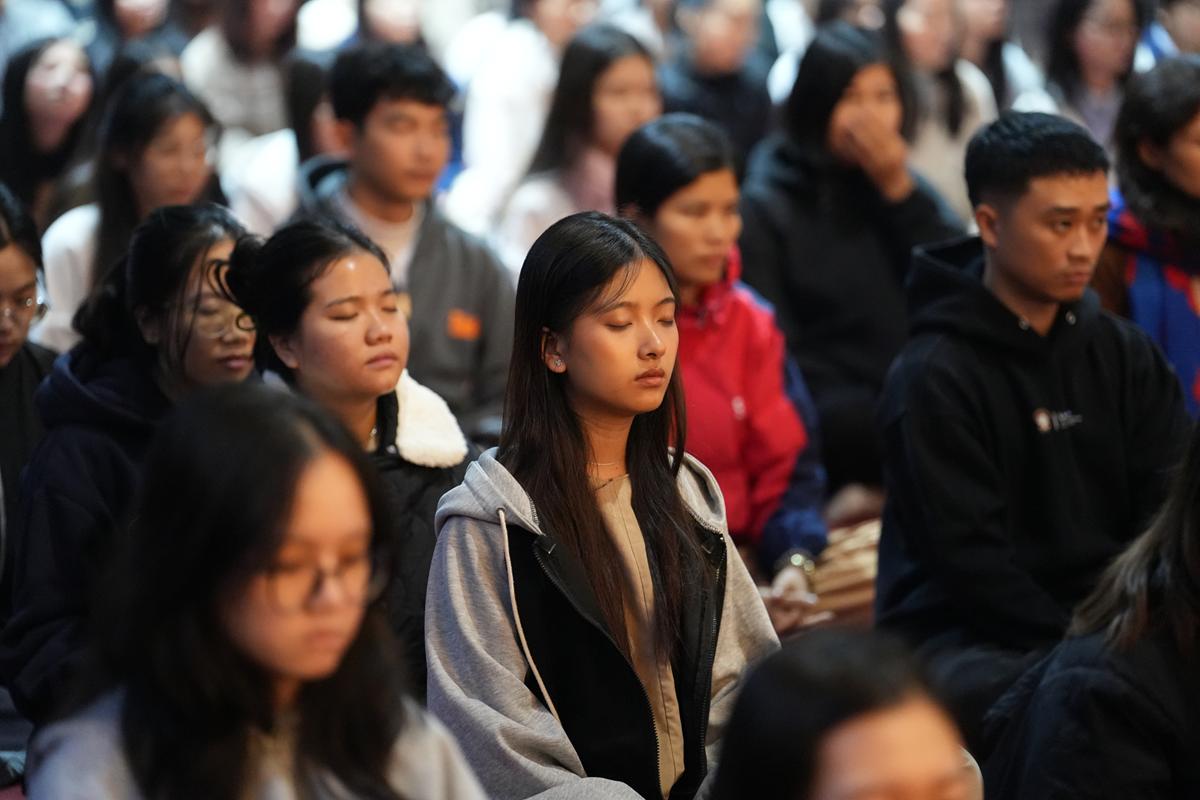 Từ sáng sớm, khi ánh bình minh còn e ấp phía chân trời, tiếng chuông chùa ngân vang giữa không gian tĩnh lặng, đánh thức đại chúng trở về với giây phút hiện tại. Toàn thể khóa sinh trang nghiêm vân tập về lễ đường, thực tập thời khóa tọa thiền dưới sự hướng dẫn của quý Thầy. Trong giây phút ấy, mỗi người học cách lắng nghe từng nhịp thở, quay về soi chiếu thân tâm. Mỗi hơi hít vào thở ra đều mở ra một sự thức tỉnh. Hít vào để cảm nhận sự an lành và vững chãi, thở ra để nhẹ nhàng buông bỏ. Hít vào ý thức sâu sắc giây phút hiện tại, thở ra mỉm cười hiền hòa, để lòng được thảnh thơi…