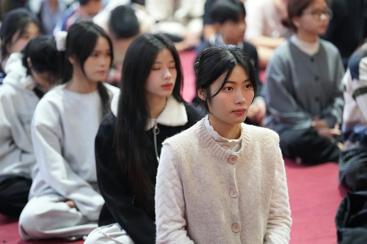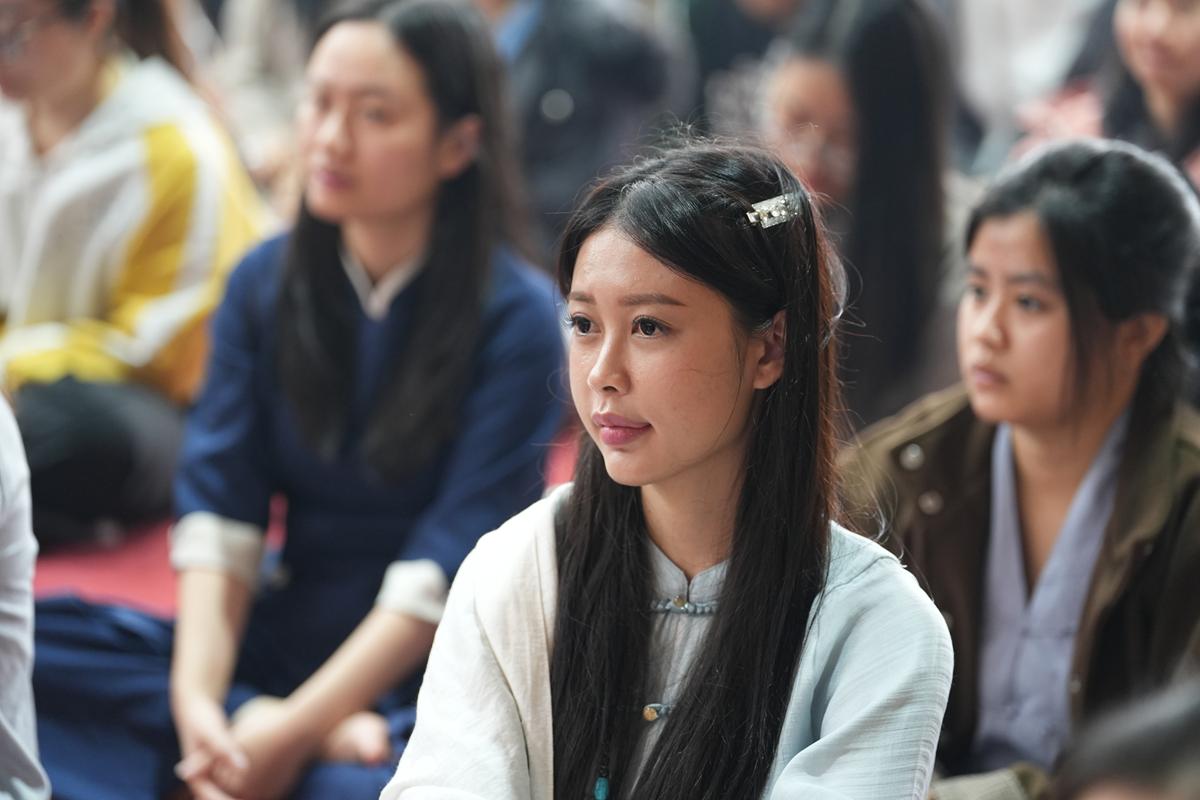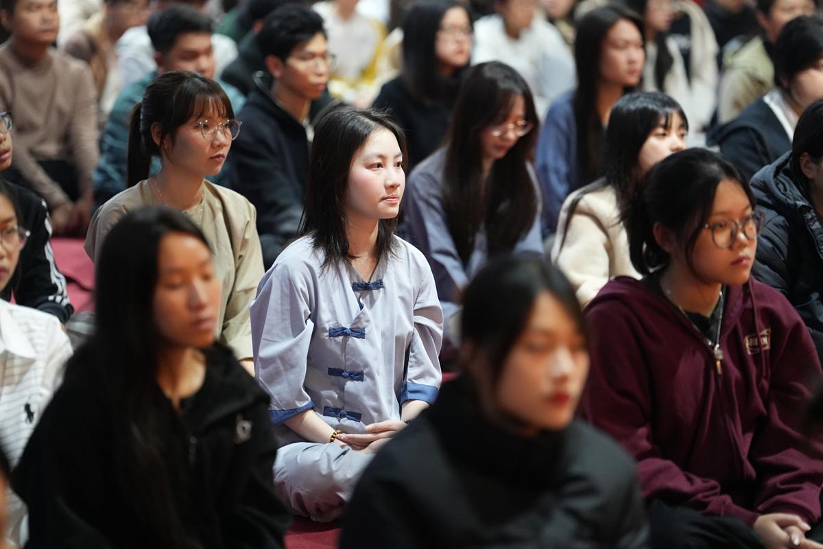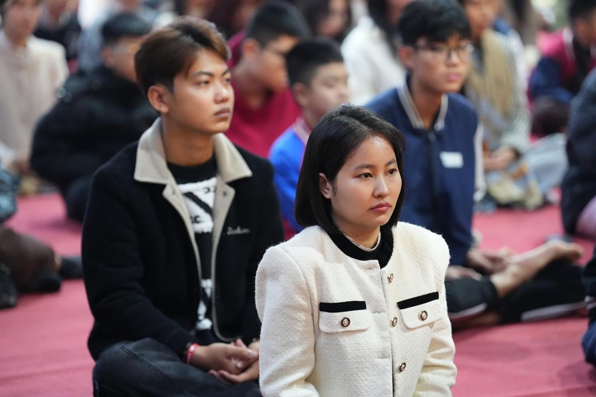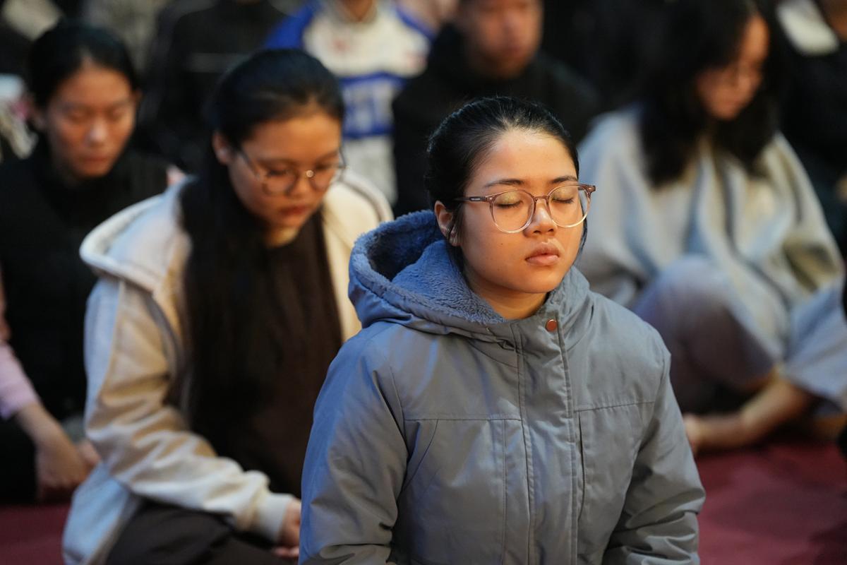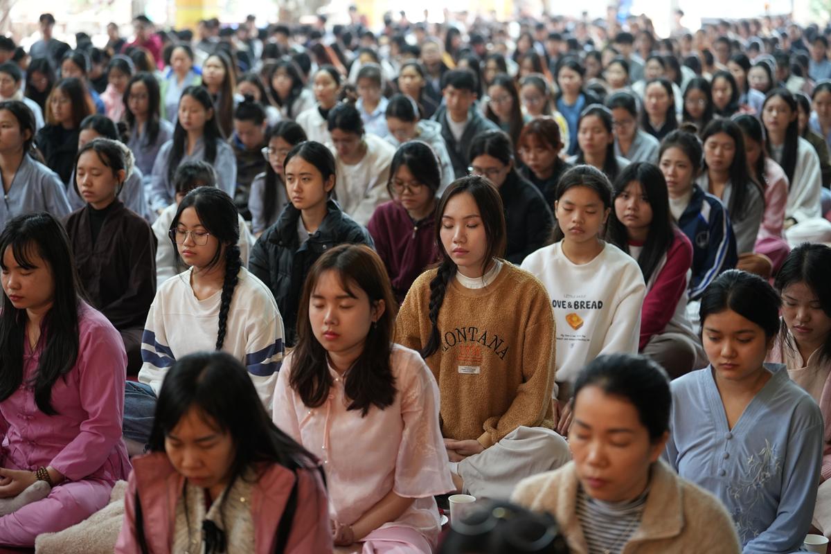 Từ sáng sớm, khi ánh bình minh còn e ấp phía chân trời, tiếng chuông chùa ngân vang giữa không gian tĩnh lặng, đánh thức đại chúng trở về với giây phút hiện tại. Toàn thể khóa sinh trang nghiêm vân tập về lễ đường, thực tập thời khóa tọa thiền dưới sự hướng dẫn của quý Thầy. Trong giây phút ấy, mỗi người học cách lắng nghe từng nhịp thở, quay về soi chiếu thân tâm. Mỗi hơi hít vào thở ra đều mở ra một sự thức tỉnh. Hít vào để cảm nhận sự an lành và vững chãi, thở ra để nhẹ nhàng buông bỏ. Hít vào ý thức sâu sắc giây phút hiện tại, thở ra mỉm cười hiền hòa, để lòng được thảnh thơi…