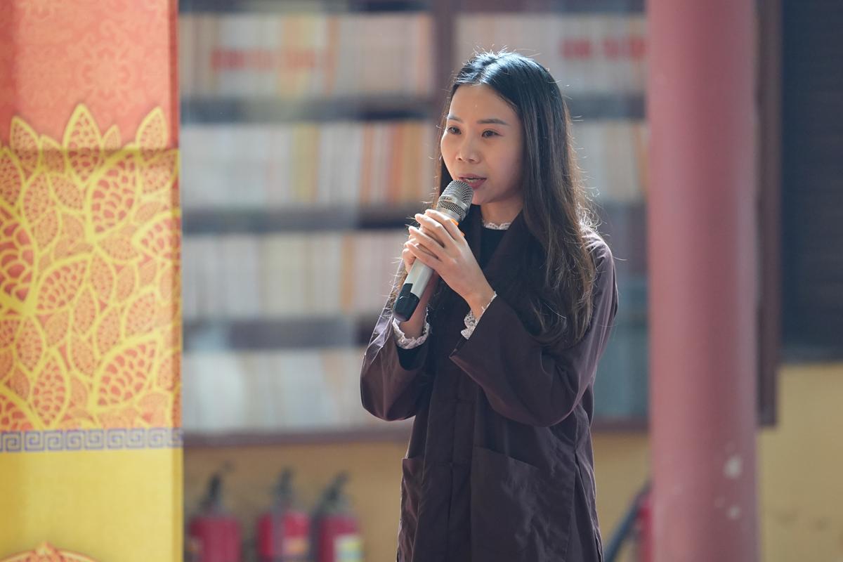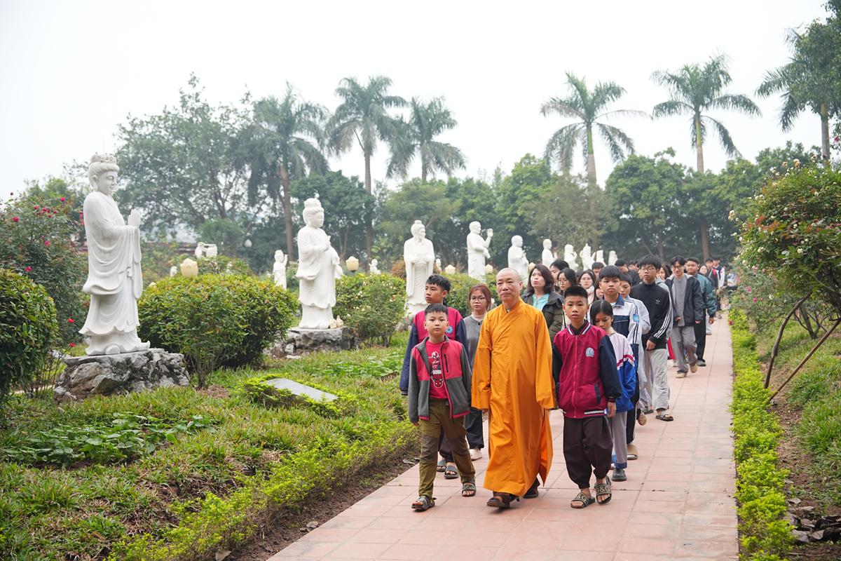 Sau đó, dưới sự hướng dẫn từ bi của Hòa thượng Thích Bảo Nghiêm, toàn thể khóa sinh lặng lẽ bước vào thời khóa thiền hành, thong dong dạo quanh khuôn viên chùa và hướng về vườn Quan Âm thanh tịnh. Không gian như lắng lại trong từng bước chân chậm rãi, vững chãi. Mỗi bước đi là một hơi thở chính niệm, là một lần trở về với thân tâm đang có mặt. Trên con đường thiền hành ấy, không còn vội vã hay tìm cầu, chỉ có sự an trú trọn vẹn trong giây phút hiện tại, nương tựa vào tự thân và nuôi dưỡng nguồn năng lượng bình an nơi tâm hồn.