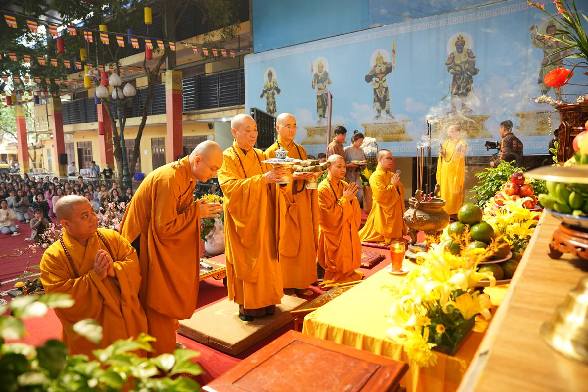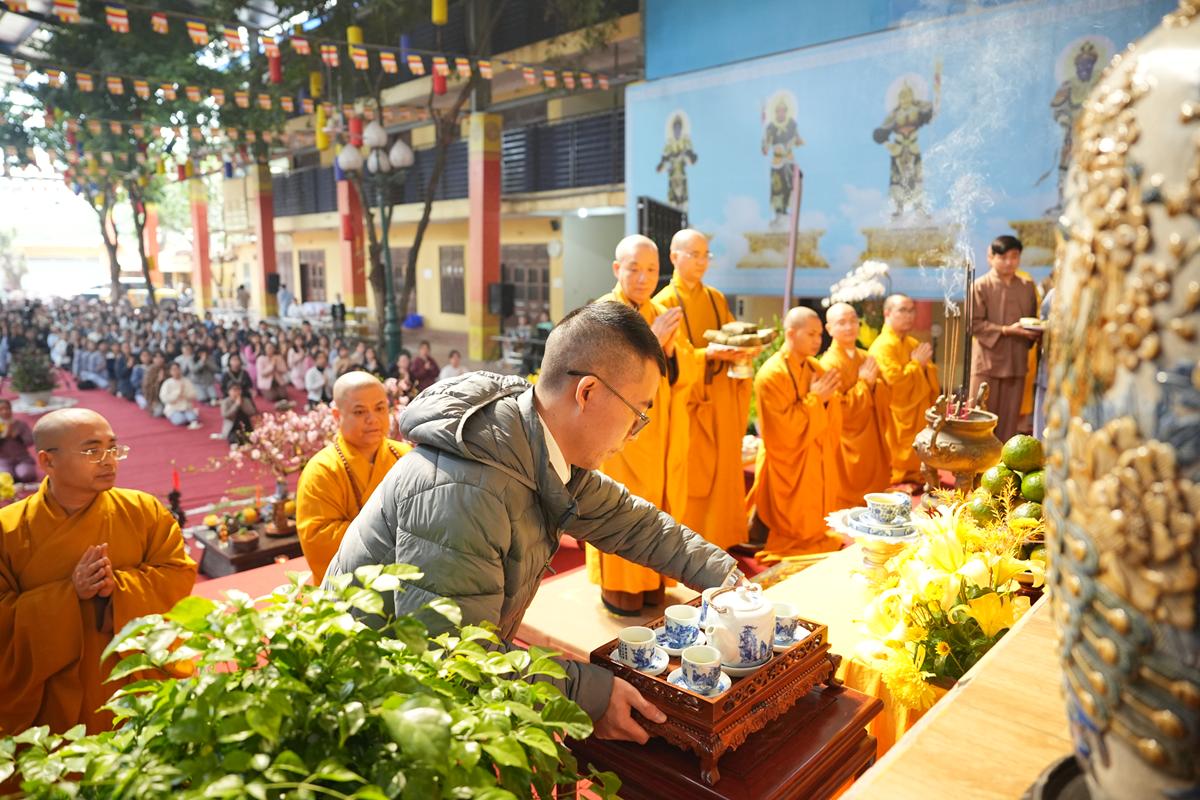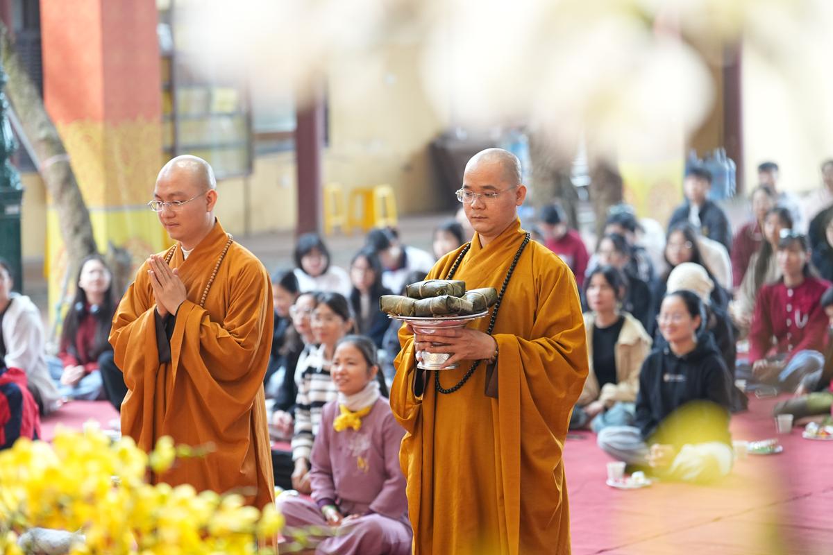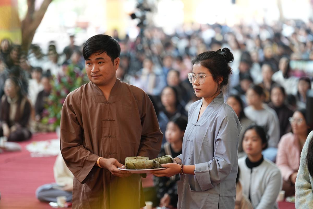 Trong không khí ấm áp của ngày đầu năm, đại chúng thành kính dâng trà, dâng bánh chưng lên cúng dàng Tam bảo, gửi gắm vào đó những ước nguyện chân thành cho một năm mới đủ đầy, an lạc và thấm đượm ân tình. Chén trà thanh khiết, chiếc bánh chưng vuông còn là biểu tượng của lòng biết ơn, của sự tiếp nối truyền thống và tâm hiếu kính hướng về cội nguồn. Đặc biệt, những chiếc bánh chưng ấy được chính tay các bạn khóa sinh gói trong khóa tu, gửi trọn tâm lành và sự chân thành vào từng nếp lá, sợi lạt.