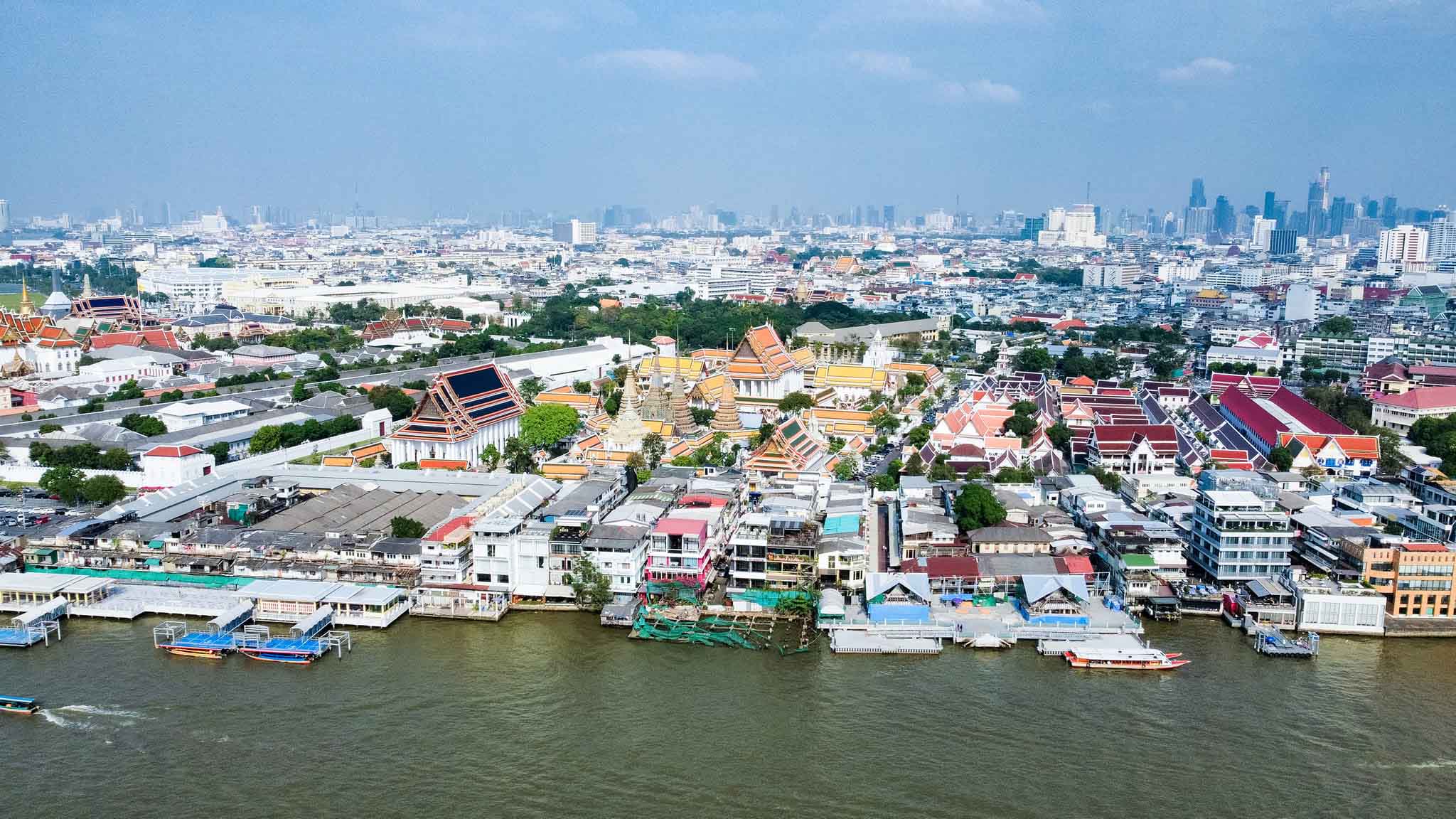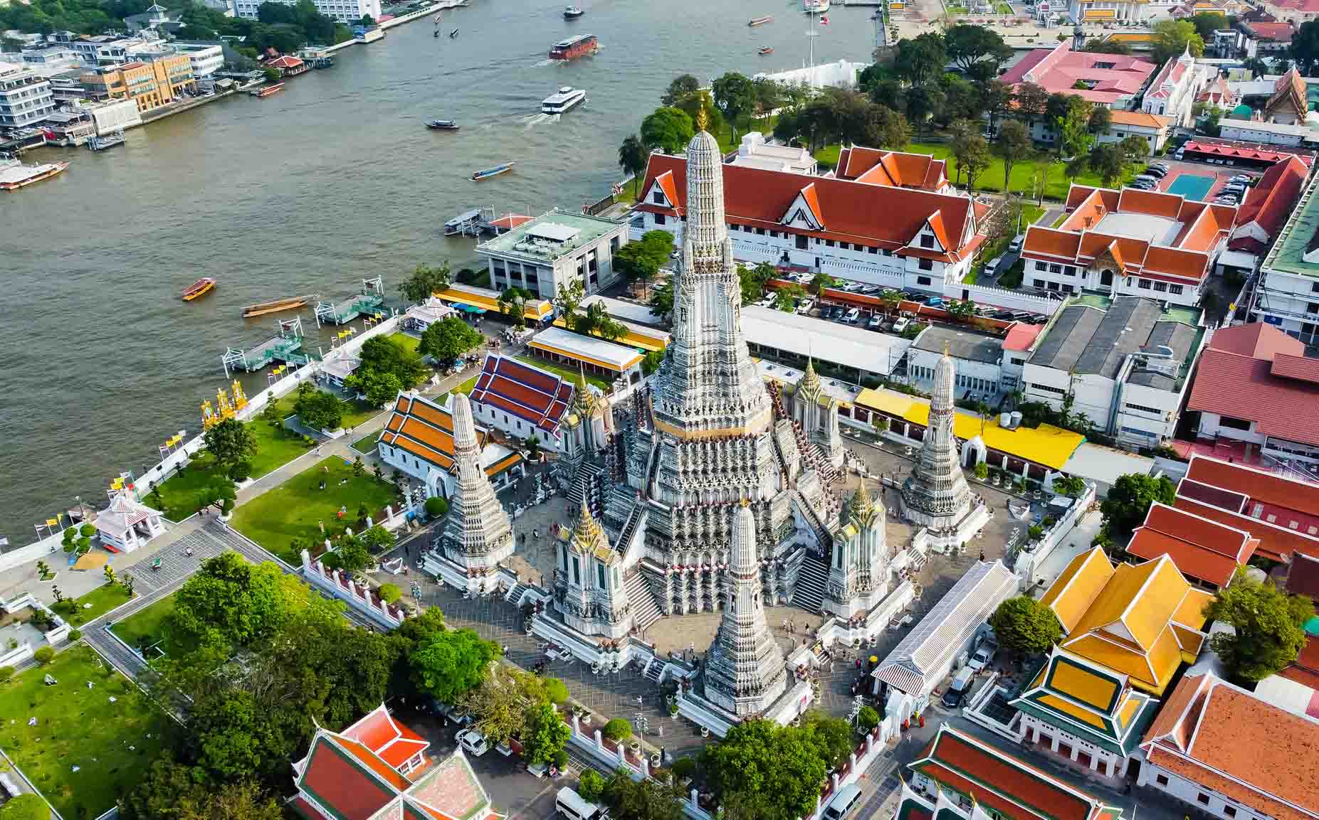 Khi đi thuyền trên sông Chao Phraya, du khách có thể thấy Wat Arun đứng uy nghi ven bờ. Ảnh: Vương Lộc