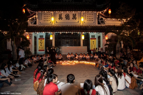 Sau lời đạo từ của Hòa Thượng trụ trì, Đại đức Thích Huệ Pháp bắt đầu điều phối cho các bạn trẻ giao lưu và ca hát dưới ánh nến được xếp thành chữ: WE LOVE EARTH (CHÚNG TÔI YÊU TRÁI ĐẤT) và chữ 60+. Đặt biệt Đại đức còn hướng dẫn các bạn trẻ tọa thiền trong vòng 10 phút để tâm thức mình lắng động hòa mình vào với Đất Mẹ, với Thiên Nhiên.
