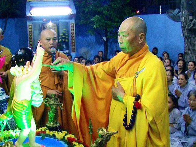 ĐĐ. Thích Thiện Phước chủ sám thực hiện nghi thức Lễ Tắm Phật. Bài kệ tắm Phật được vang lên trong không khí trang nghiêm, thanh tịnh đưa hội chúng trở về với lịch sử đản sinh của gần ba nghìn năm trăm năm về trước:
