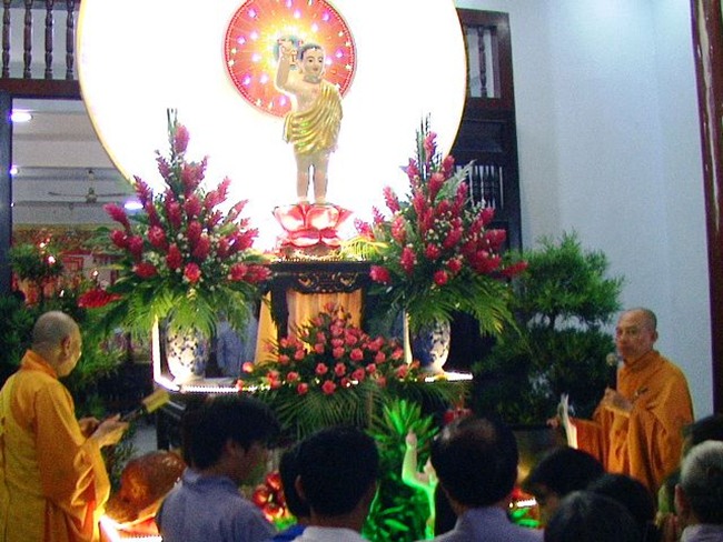 Hòa thượng Chứng minh thành kính dâng hoa, tắm Phật, tiếp theo là chư Tôn đức Tằng và toàn thể Phật tử tham dự lần lượt, trang nghiêm thực hiện nghi lễ tắm Phật.